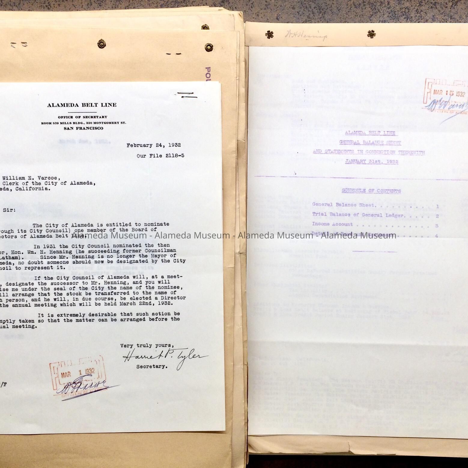 History of Object: Folders found in the attic of City Hall in the 1990s, refolderd in 2012. This folder holds financial balance sheets from the Alameda Belt Line, 1928-1932. Except at #51, is a letter to City Clerk William E. Varcoe, notifying that the City of Alameda has the right to nominate, through the council, one member of the Beltline Board of Directors, suggesting a successor to Mayor Henning be found.