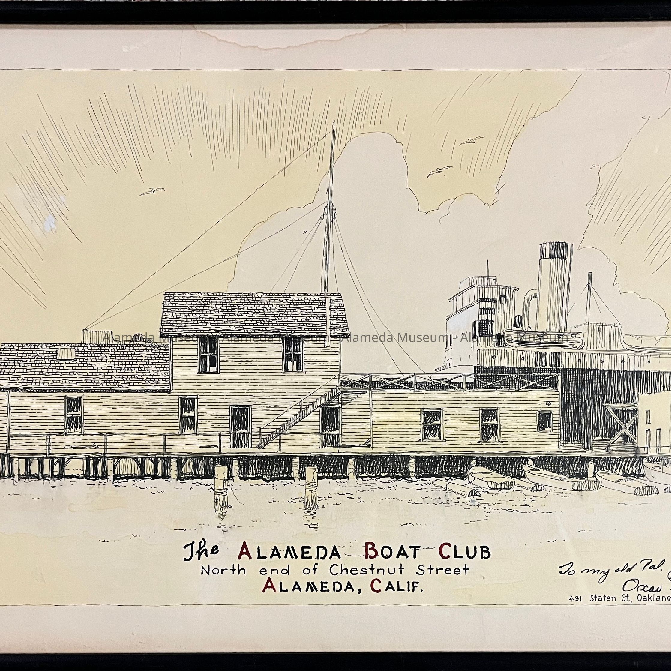 History of Object: It is a pen and ink drawing of the Alameda Boat Club, at the north end of Chestnut Street, in Alameda California. The artist is Oscar Bryn, 491 Staten Street, Oakland, Calif. March, 1954.