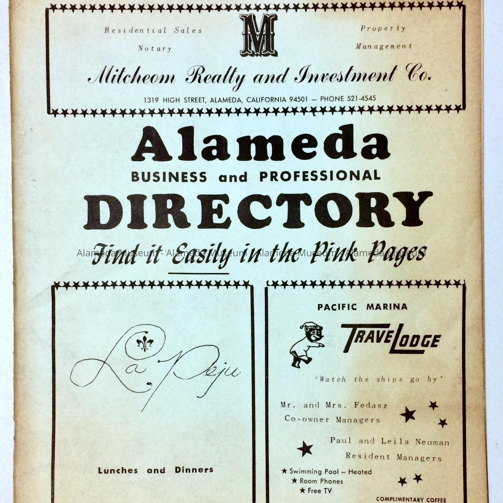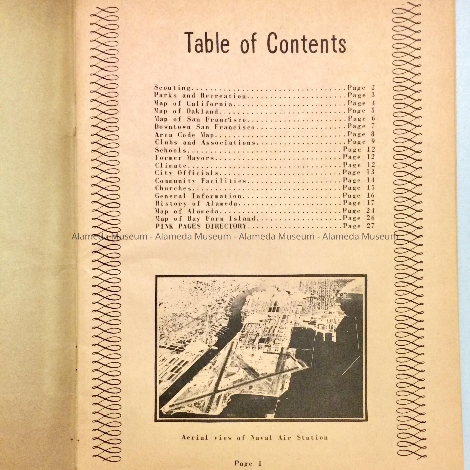 HISTORY OF OBJECT: A DIRECTORY LISTING BUSINESSES, CHURCHES, PROFESSIONAL ORGANIZATIONS, ETC. BOOK WAS ISSUED DURING THE ADMINISTRATION OF MAYOR TERRY LA CROIX. BOOKLET ALSO INCLUDES AN ILLUSTRATED HISTORY OF ALAMEDA.