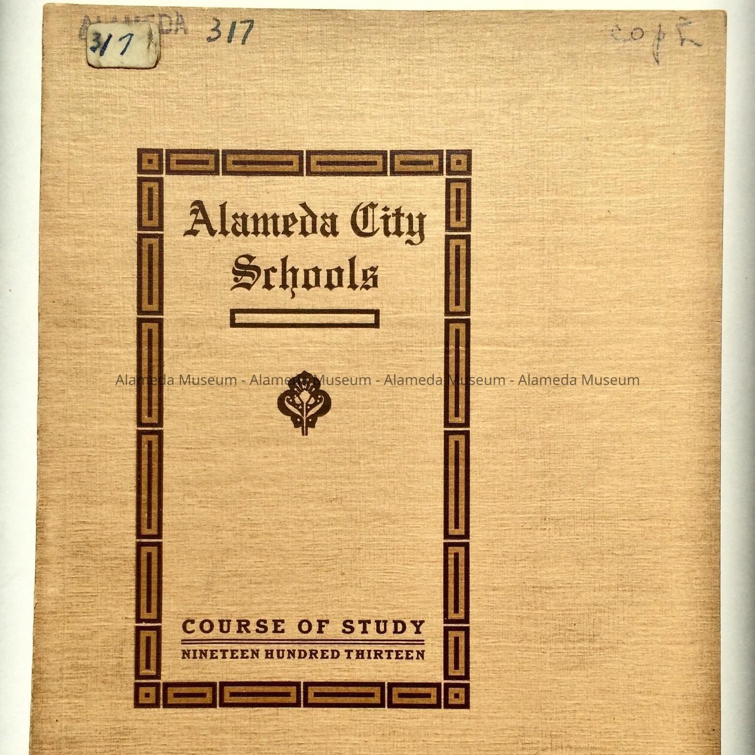 Soft bound booklet. Cover has bold printed caption "Alameda City Schools" in brown colored type on a tan colored background.