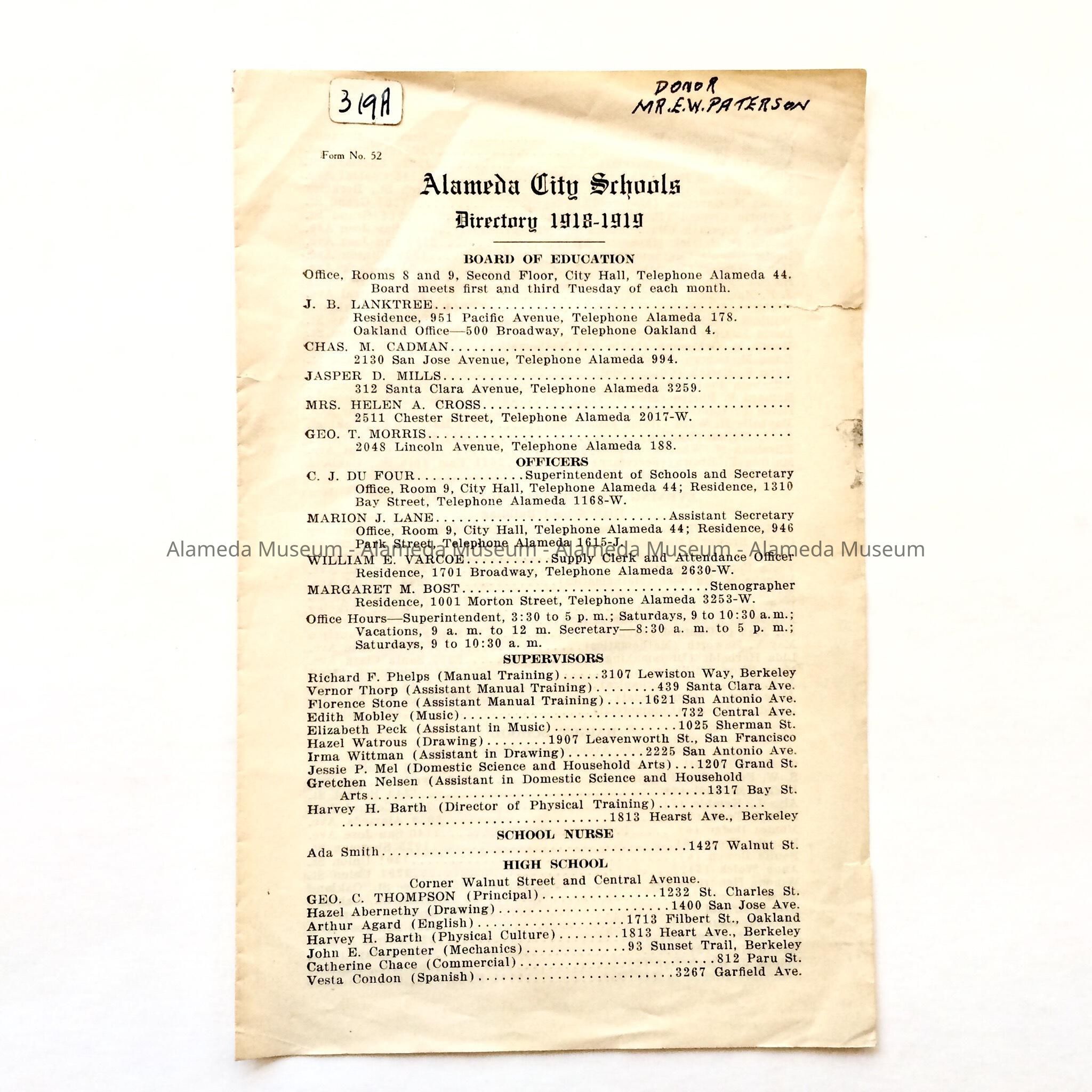 Alameda City Schools directory, 1918-1919Entry/Object ID