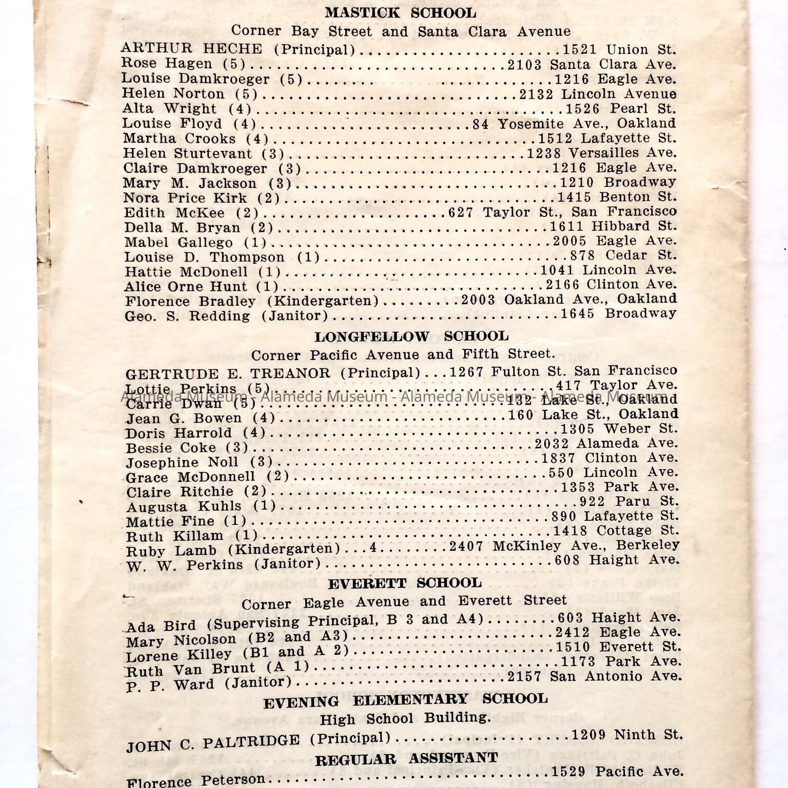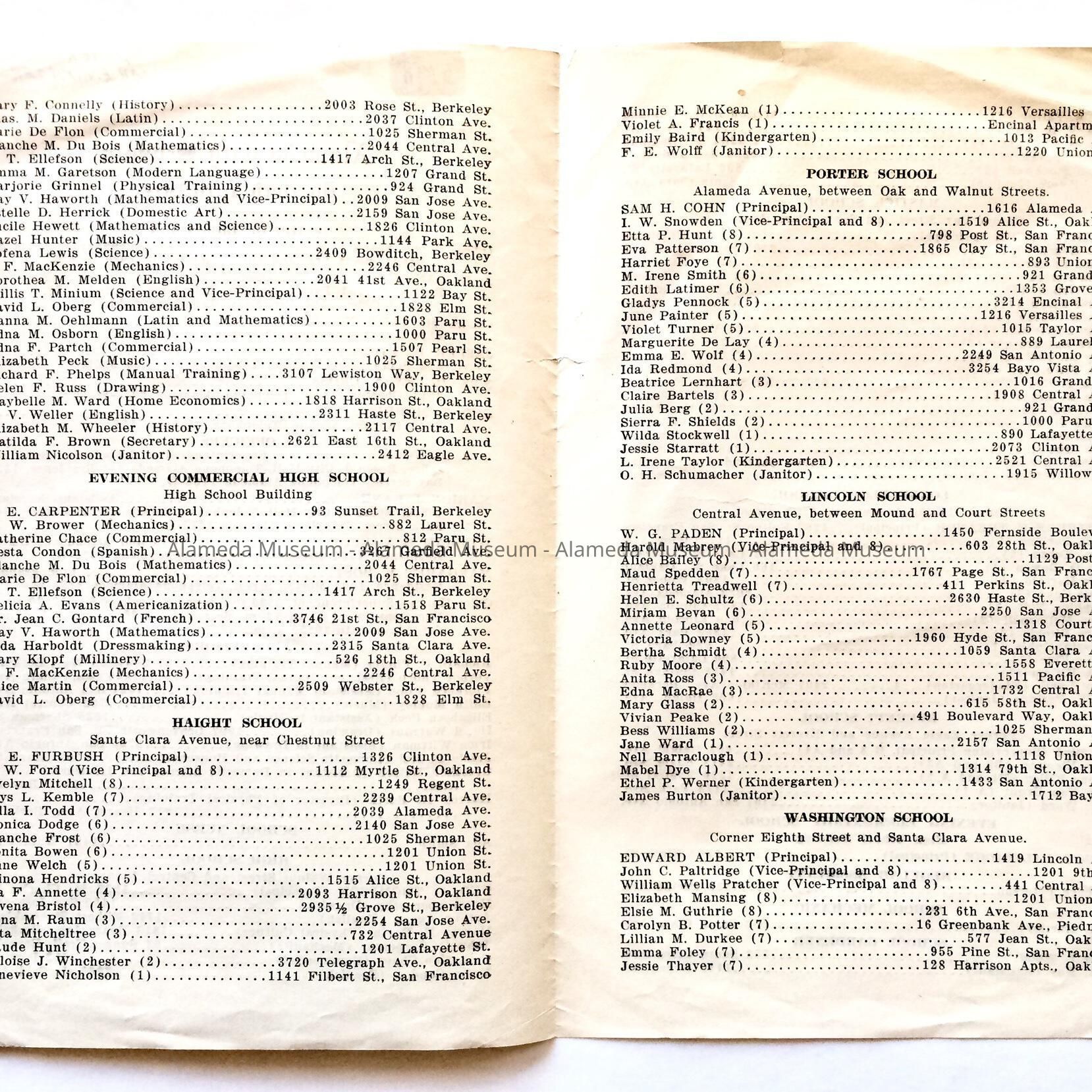 Two (2) page directory giving names and addresses of the Board of Education and all teaching staff throughout the Alameda School District.