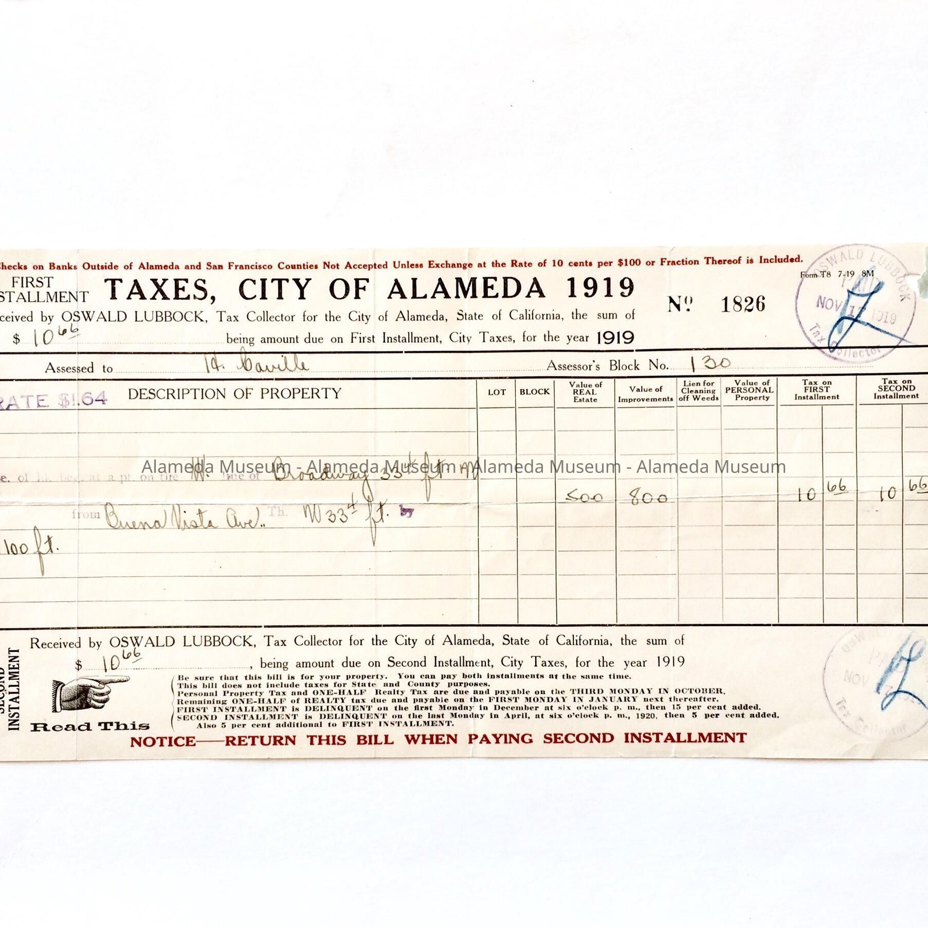 History of Object: Alameda city tax form assessed to H. Cavill, 1705 Broadway, for 1919.