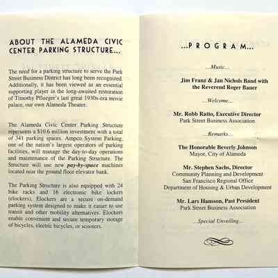 History of Object: Program for the dedication ceremony for Alameda’s first public parking garage, attached to the restored and expanded Alameda Theatre, January 31, 2008.
