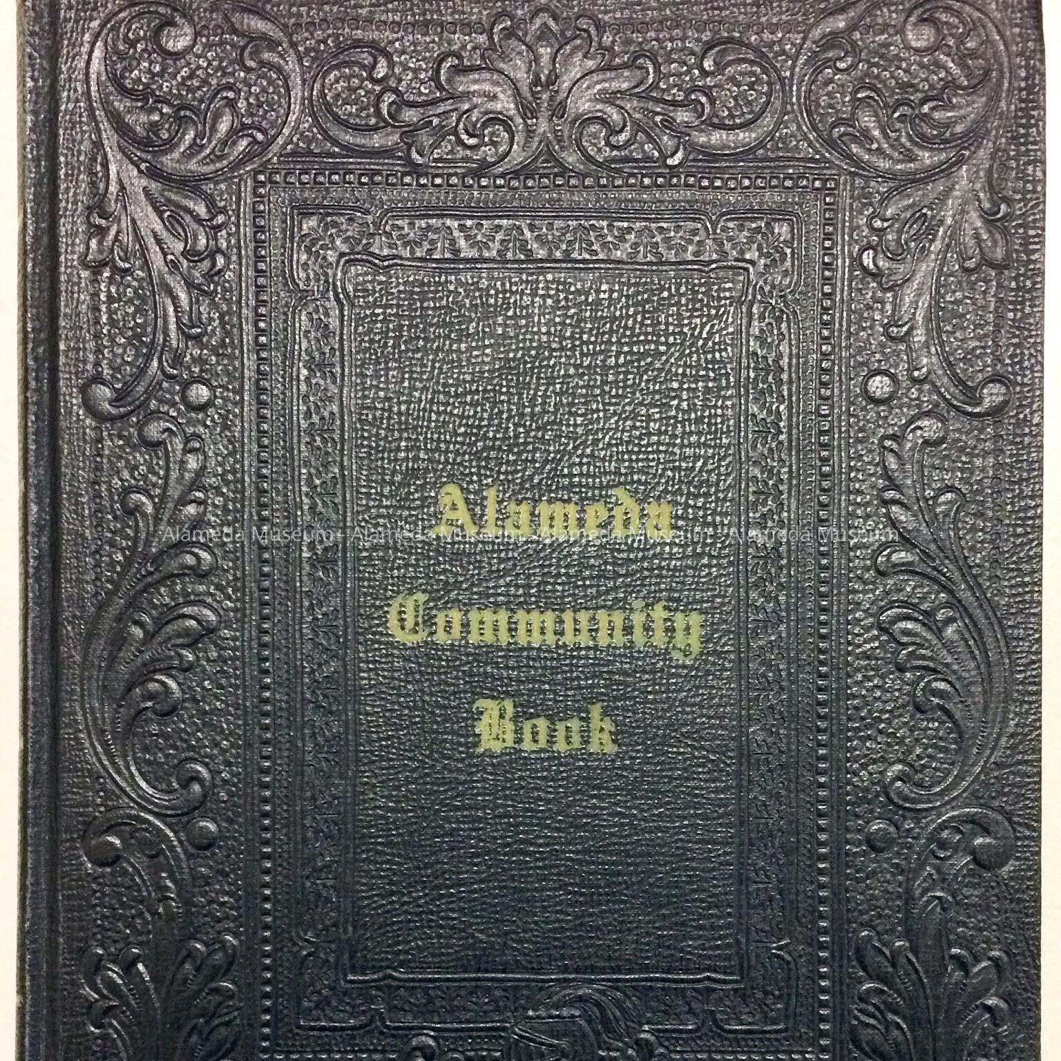 HARD-BOUND BOOK, WITH COVER OF EMBOSSED PLASTICIZED BUCKRAM. COVER AND SPINE STATE, "ALAMEDA COMMUNITY BOOK," IN GOLD-COLORED TYPE. BOOK WAS PUBLISHED BY A'H CAWSTON, MANAGING EDITOR AND PUBLISHER, ALAMEDA, CALIFORNIA.