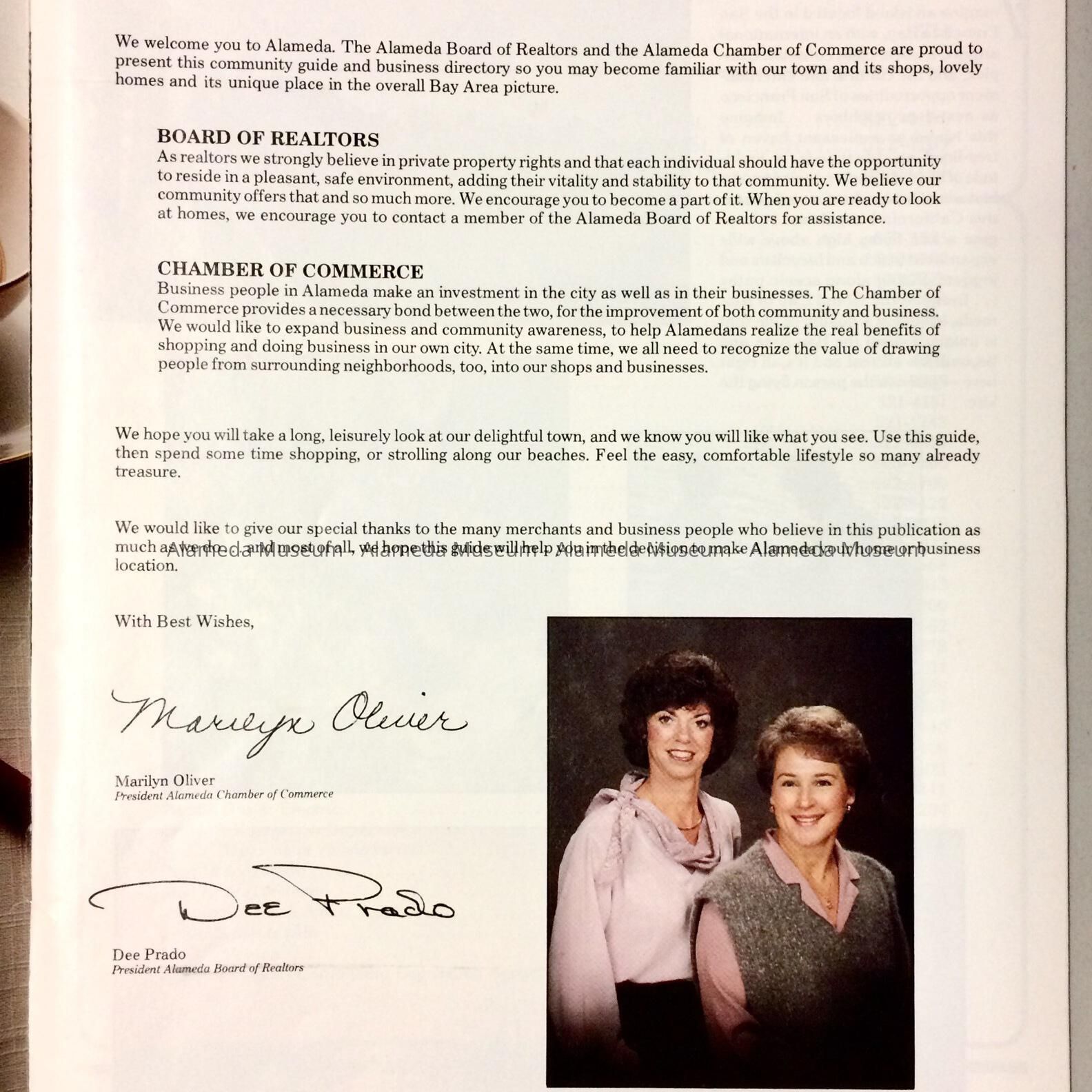A COMMUNITY GUIDE AND DIRECTORY THROUGH THE AUSPICES OF THE ALAMEDA BOARD OF REALTORS AND ALAMEDA CHAMBER OF COMMERCE. THE PUBLICATION REPRESENTS LOCAL BUSINESSES, AND INCLUDES A SECTION ON THE HISTORY OF THE CITY OF ALAMEDA, USE OF HOMES, CHURCHES, ETC.