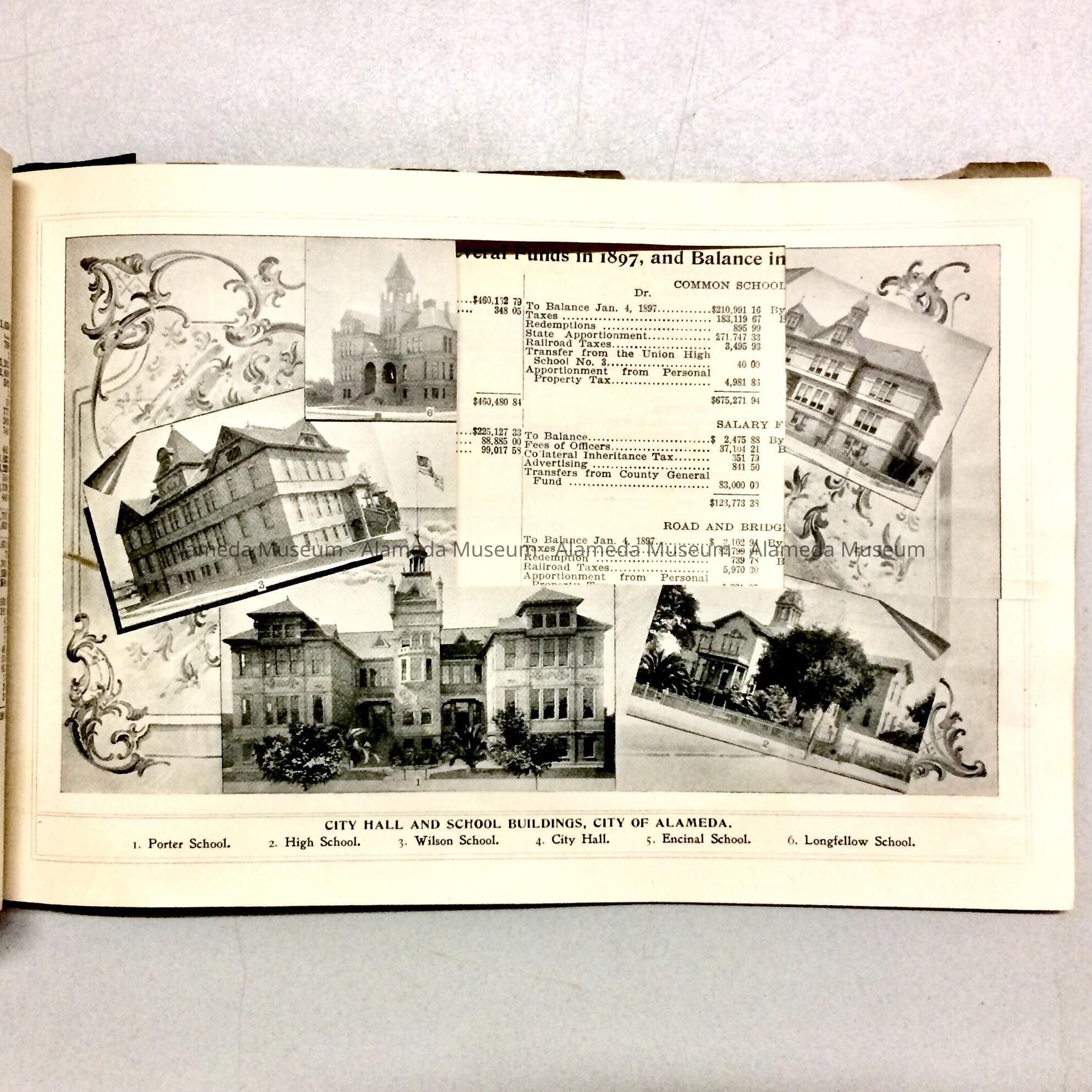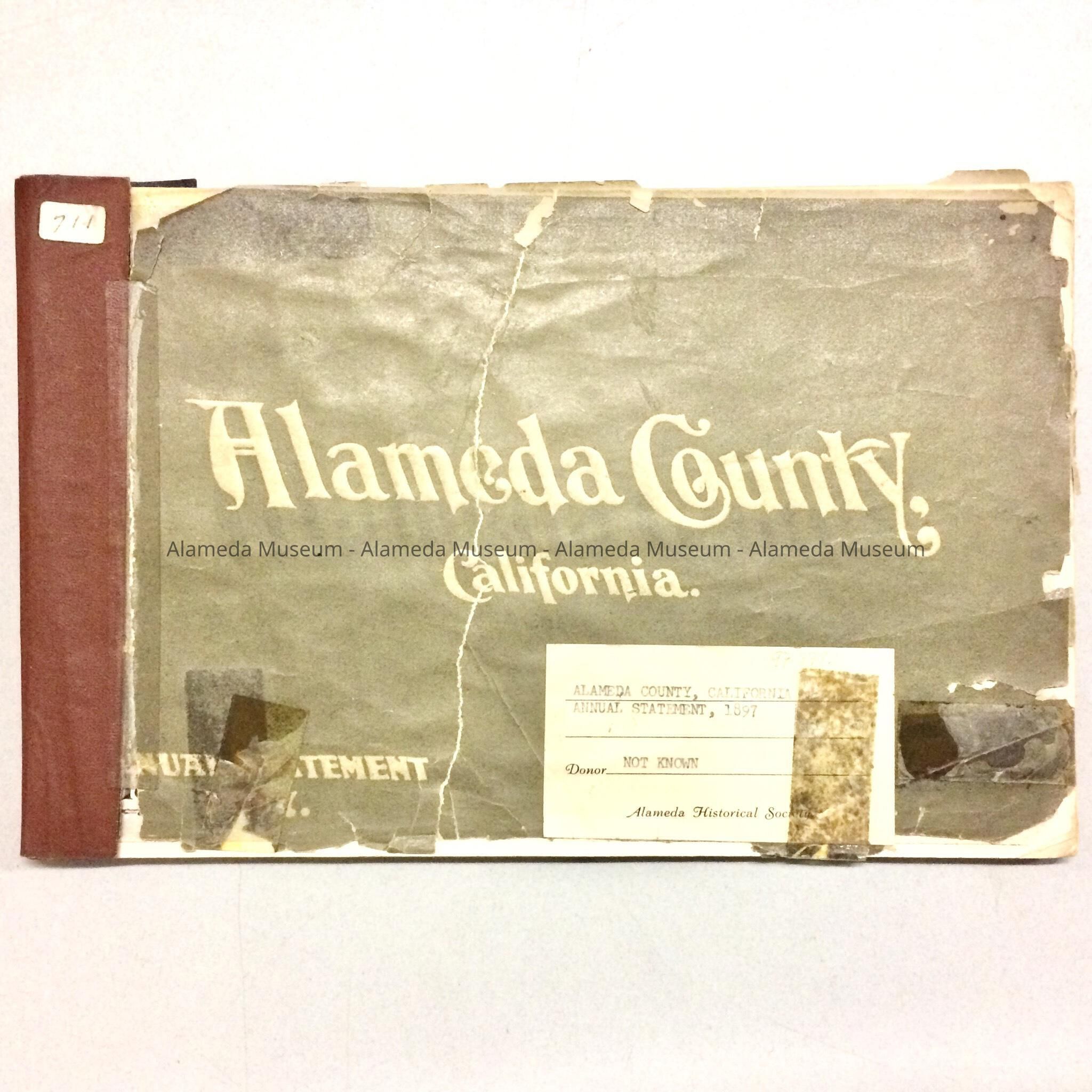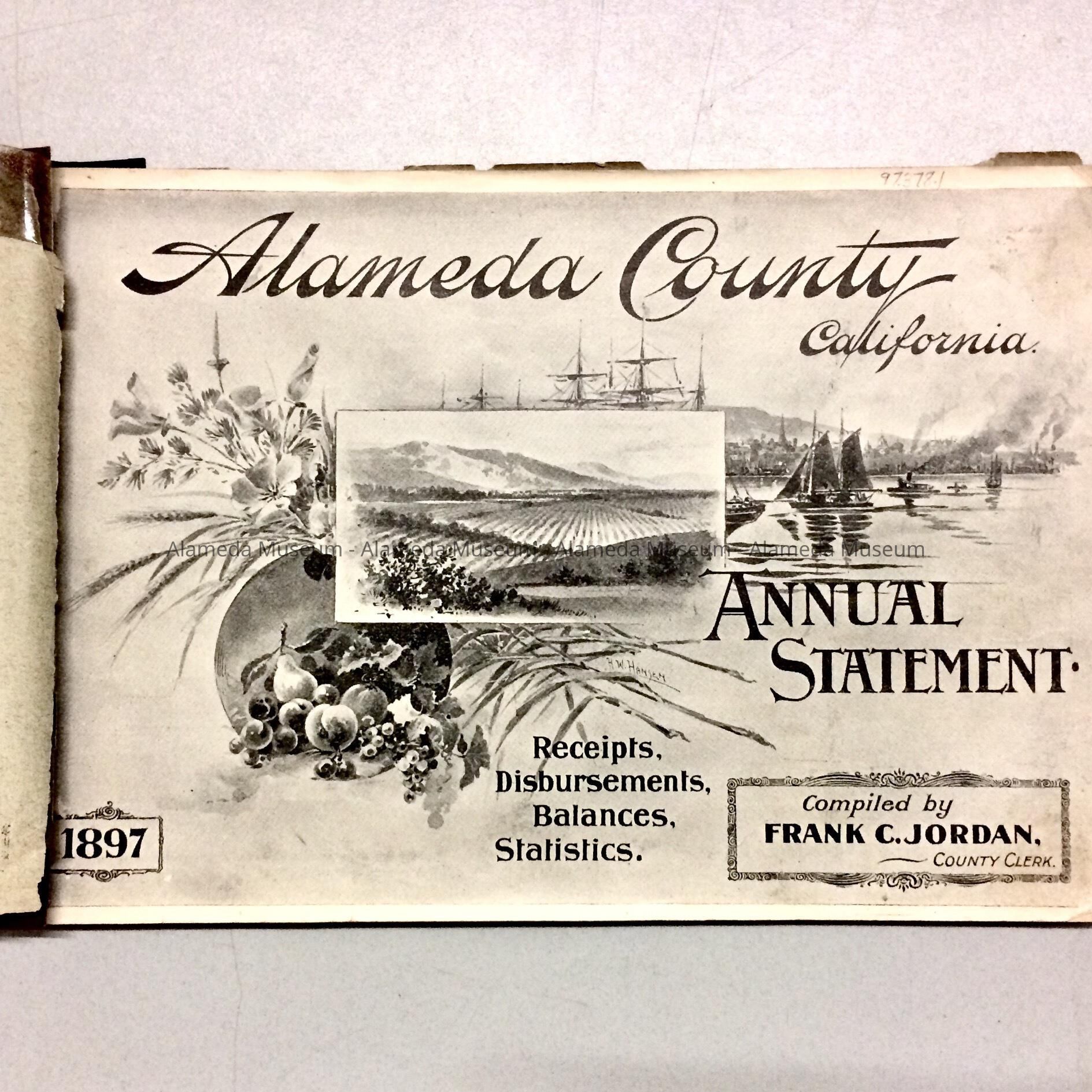 BOOKLET ENTITLED, "ALAMEDA COUNTY, CALIFORNIA," --- AN ANNUAL STATEMENT OF RECEIPTS, DISBURSEMENTS, BALANCES, STATISTICS, COMPILED BY FRANK C JORDAN, COUNTY CLERK, FOR 1897. ADJOINING PAGE 56 IS A COMPOSITE PHOTOGRAPH WITH VIEWS OF EARLY GRAMMAR SCHOOLS IN ALAMEDA. PAGE 2 IN THE REAR SECTION INCLUDES A SHORT DESCRIPTION OF THE CITY OF ALAMEDA. THIS VOLUME WAS GIVEN TO THE ALAMEDA HISTORICAL SOCIETY PRIOR TO 1971, AND NUMBERED "711."