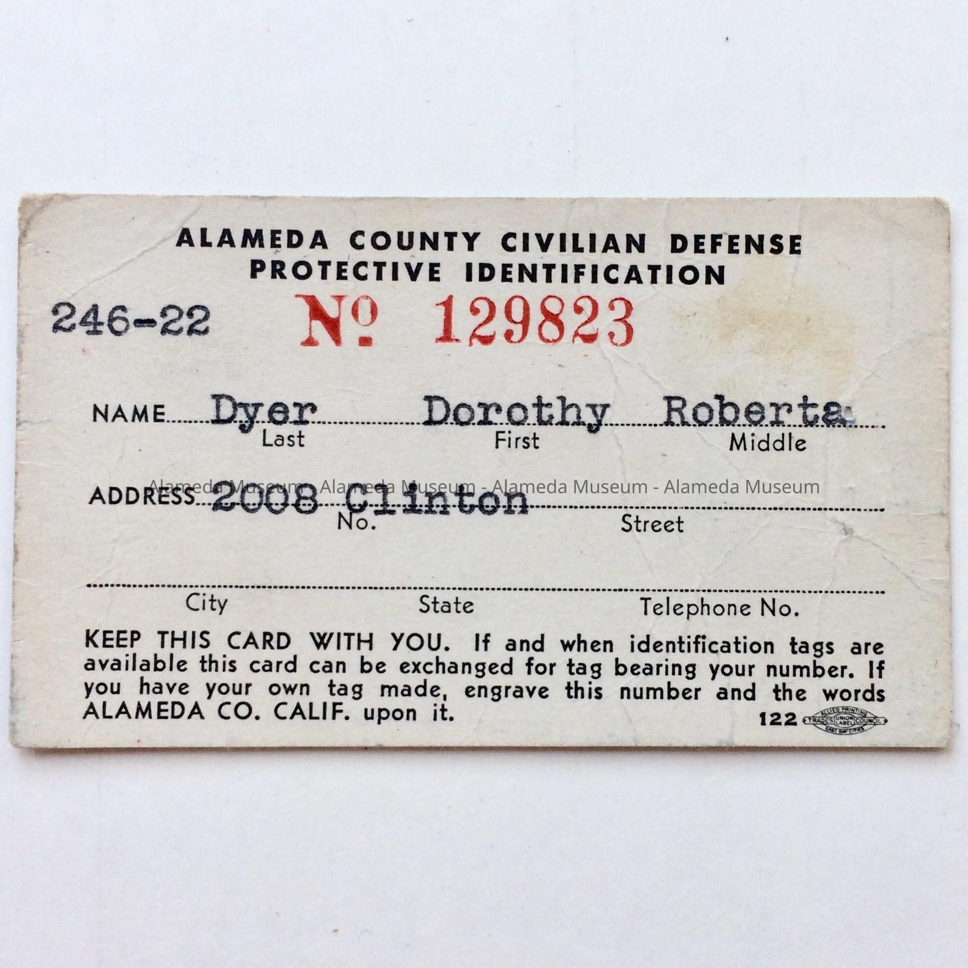A MEMBERSHIP CARD, ISSUED TO DOROTHY DYER, 2008 CLINTON AVENUE, ALAMEDA. SHE WAS A MEMBER OF THE ALAMEDA COUNTY CIVILIAN DEFENSE LEAGUE.