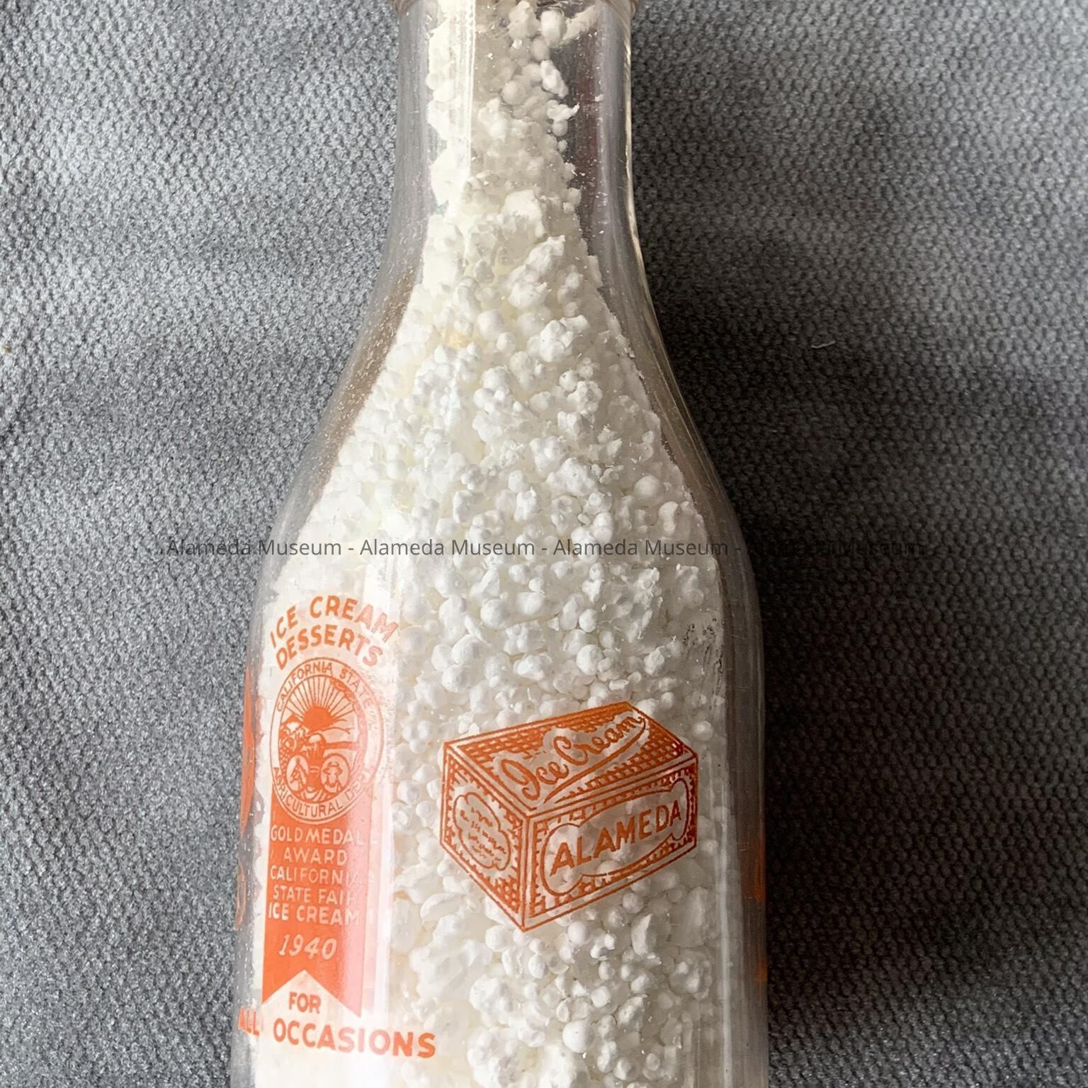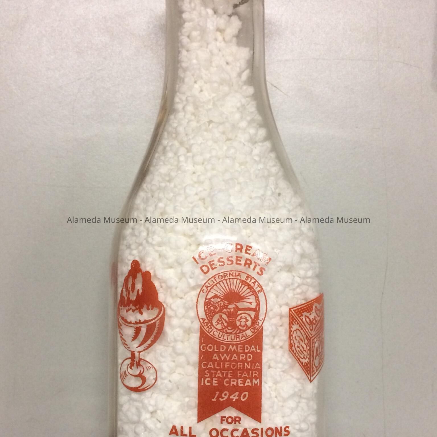 Description: 1 Quart Milk Bottle, with blown neck and seamed lower section, with seal seat, and embossed on bottom edge: Registered Sealed 1-14-14 ; 1 MINN ; One Quart Liquid; A3', and imprinted on one side: Alameda Dairy Company - Alameda Reg. Calif., and on the other side, an image of an icecream coupe on the left, an Ice Cream package on the right, and in the middle an image of a medal and ribbon, with heading: Ice Cream Desserts; California State Agricultural Dept., Gold Medal Award California State Fair - Ice Cream, 1940, with underneath: For All Occasions. Includes bottle cap of off-white cardboard, featuring an image of a smiling girl with heading 'Skim Milk', 'Double Cap Protected With Seal On'.