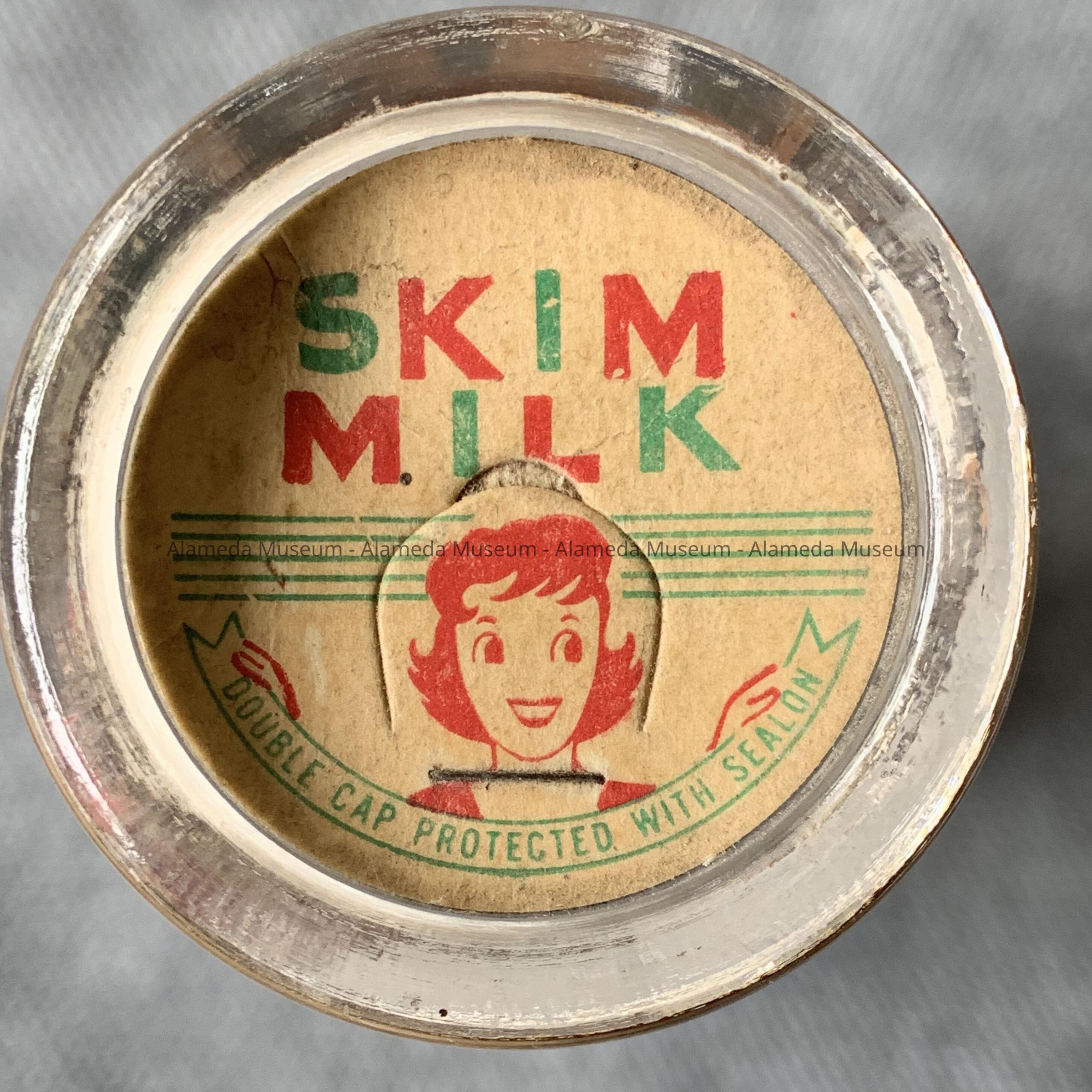 History of Object: Quart bottle with Skim Milk bottle cap from the Alameda Dairy, 2320 Central Ave, c. 1940. Bottle caps did not need to be usable past the life span of the milk. They were often color coded. The bottle has a special rim in the neck to prevent the cap from going down further.
