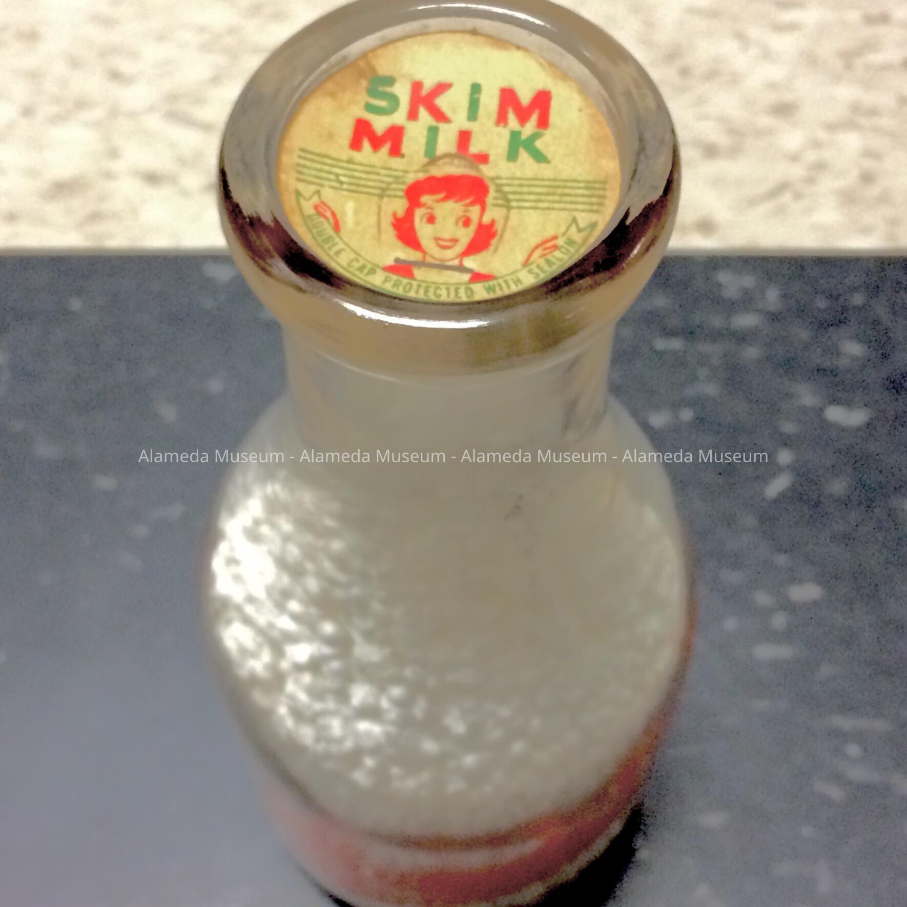 Alameda Dairy 1 Quart Bottle with Skim Milk bottle cap, c. 1940.Entry/Object ID