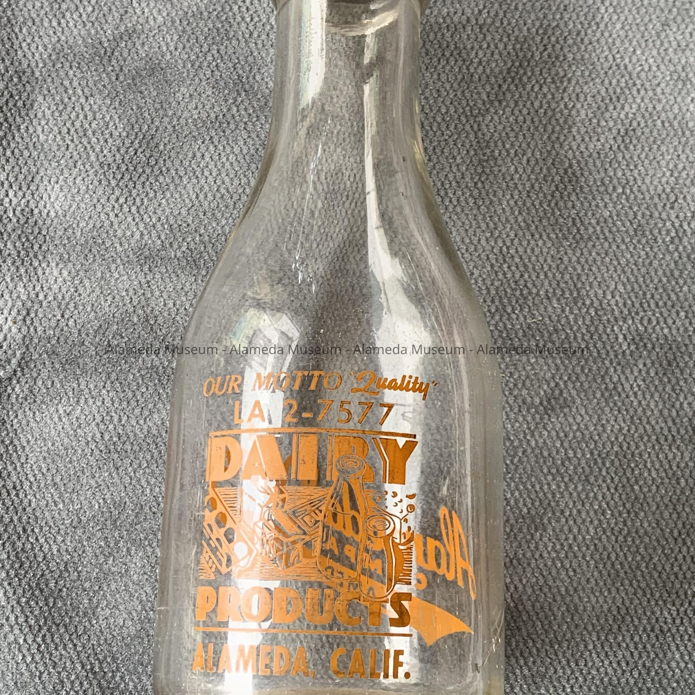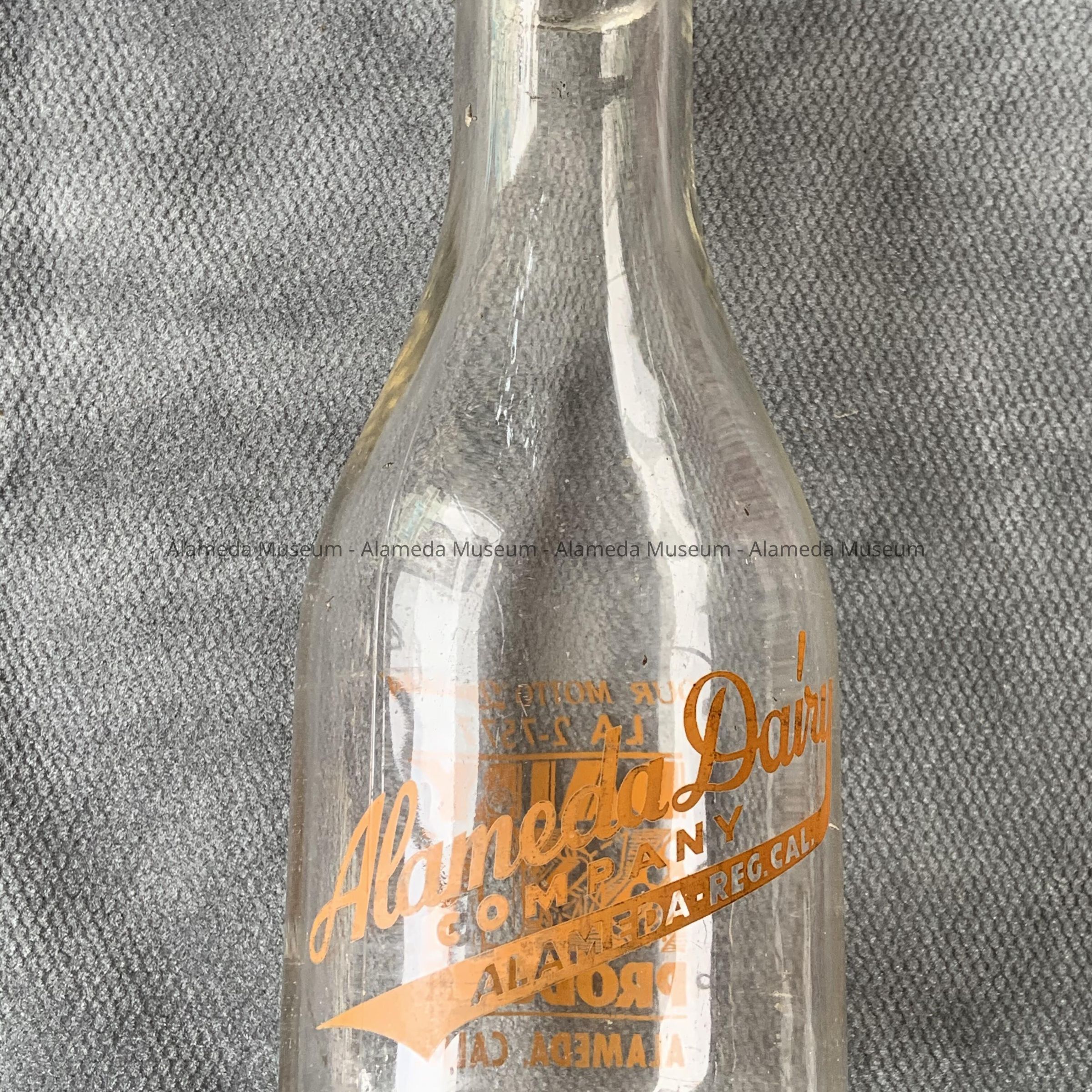 Description: A clear glass quart size milk bottle with a double label; one reads, “Alameda Dairy,” and the other reads, “Dairy Products, Alameda, Calif. Ph. LA 2-7577”.