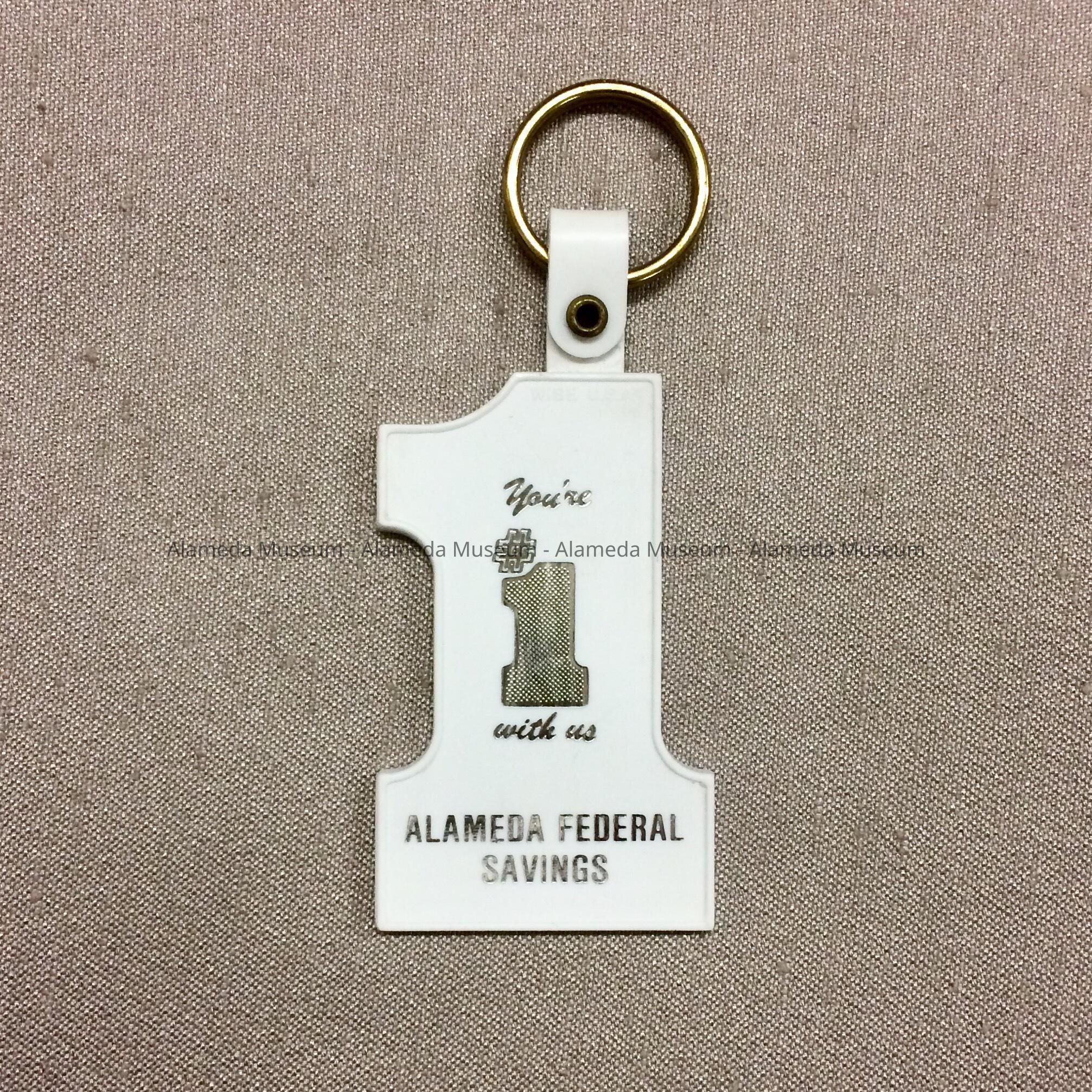 Description: A white plastic number '1' attached to a metal looped ring, with in silver print: 'You’re #1 with us - Alameda Federal Savings'