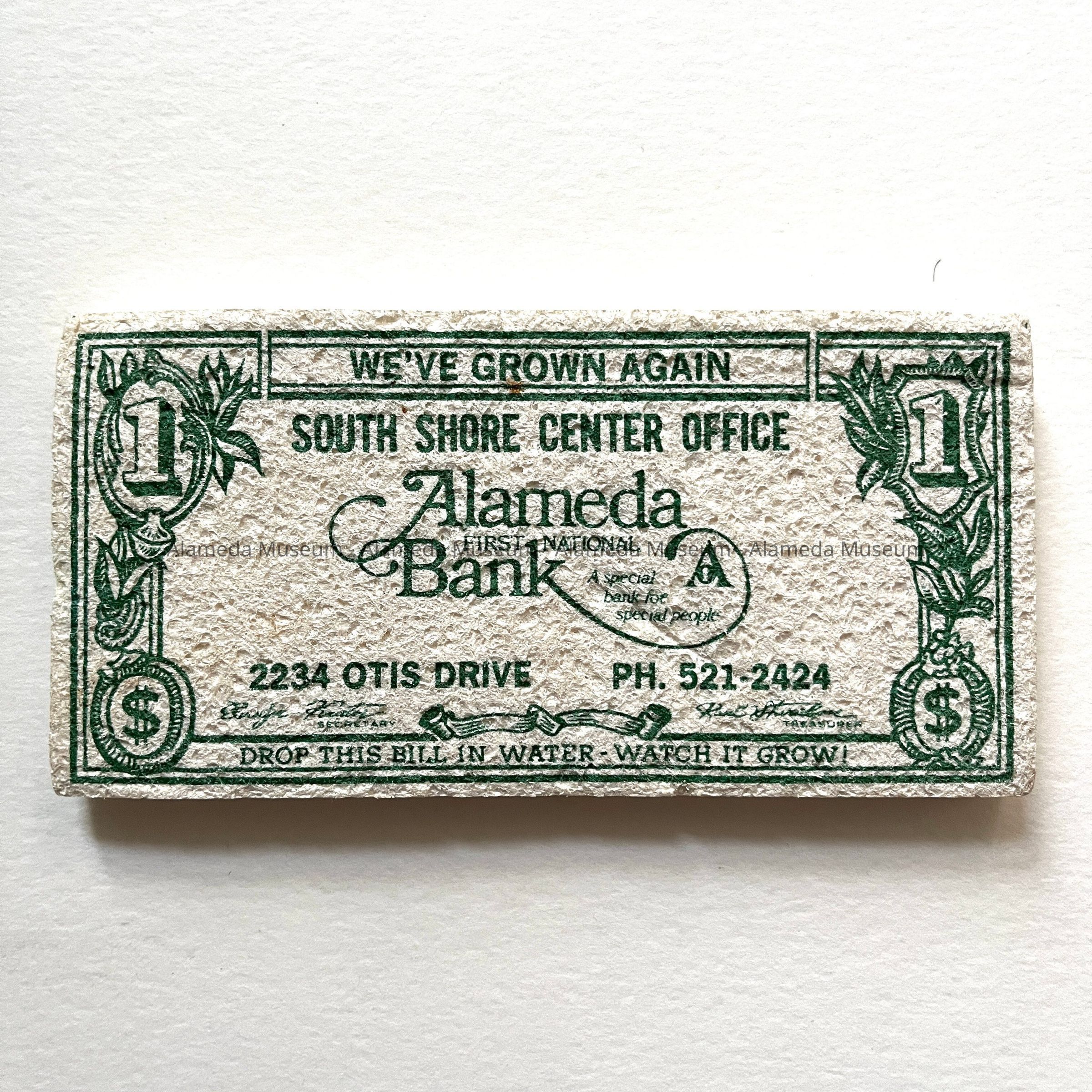 Description: Sponge, White, rectangular sponge. Front states 'We've Grown Again / South Shore Center Office / Alameda First National Bank / 2234 Otis Drive, Ph. 521-2424'. Object further has the color and design of a green $1 bill, and states 'DROP THIS BILL IN WATER - WATCH IT GROW!'.