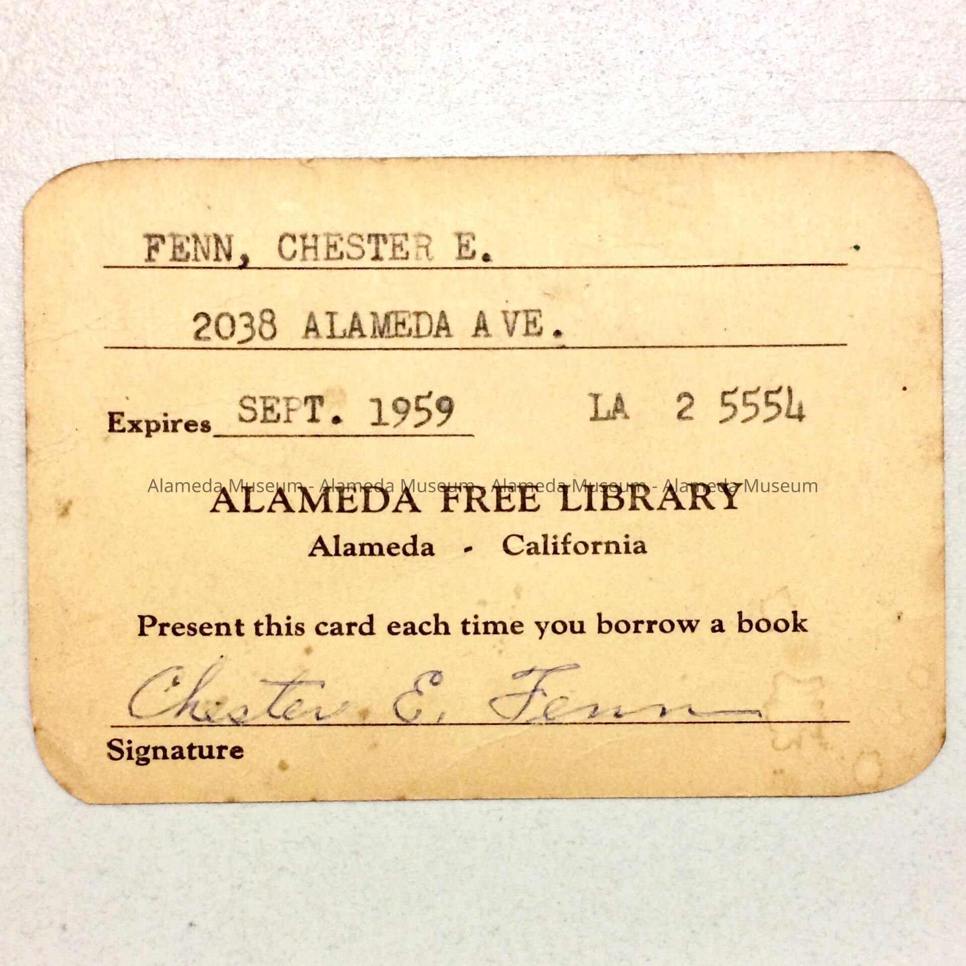 Alameda Free Library card issued to Chester E. Fenn, 1959Entry/Object ID
