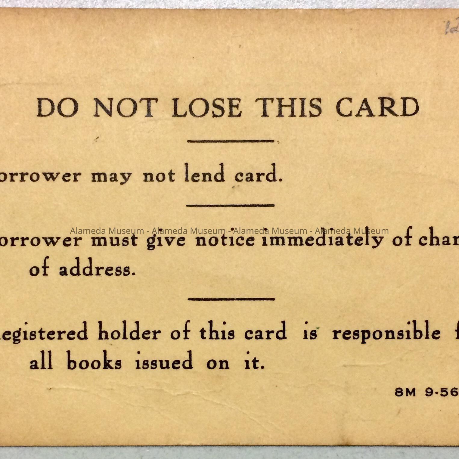 Description: Card printed on heavy paper stock with a bold printed caption in black colored type, "Alameda Free Library."