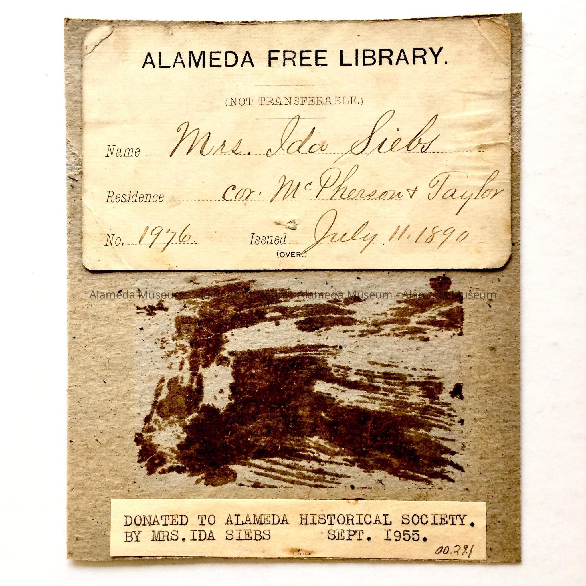 Card issued by the Alameda Free Library to Mrs. Ida Siebs, corner McPherson (9th Street) and Taylor, issued July 11, 1890.