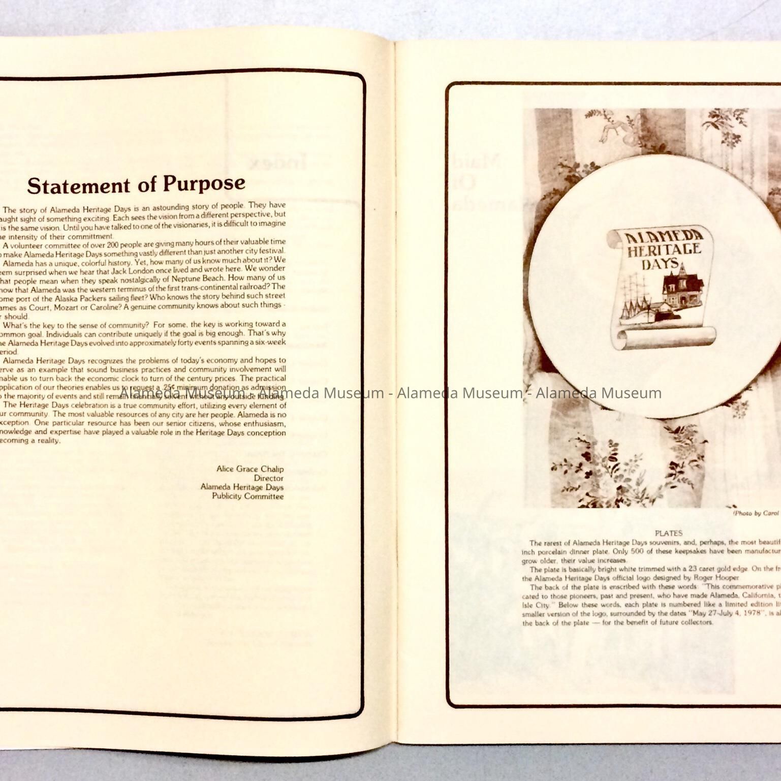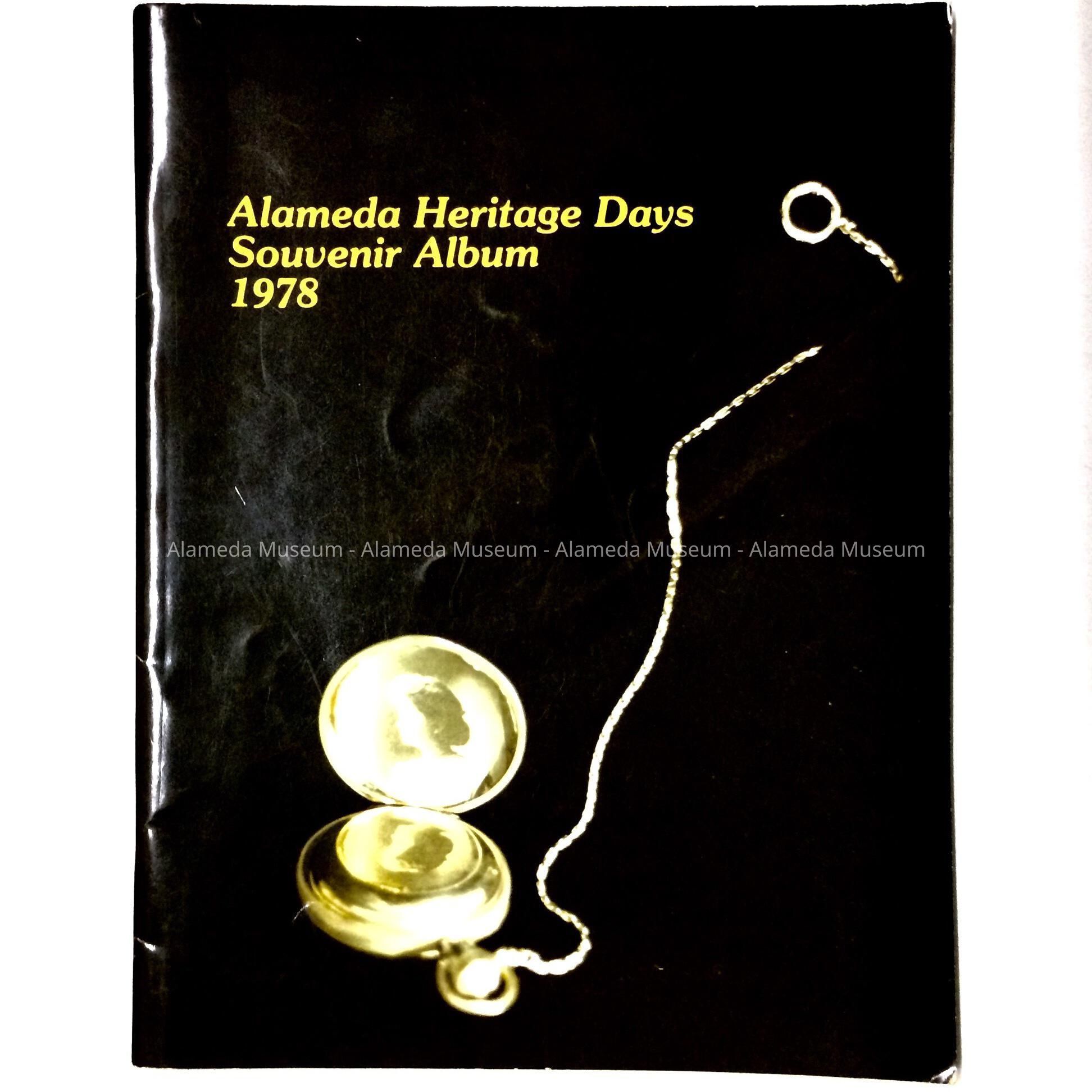 SOFT-BOUND BOOKLET, WITH COVER DESIGN FEATURING COLORED PHOTOGRAPH OF A POCKET WATCH, IN BOLD-PRINTED CAPTION, "ALAMEDA HERITAGE DAYS, SOUVENIR ALBUM, 1978.".