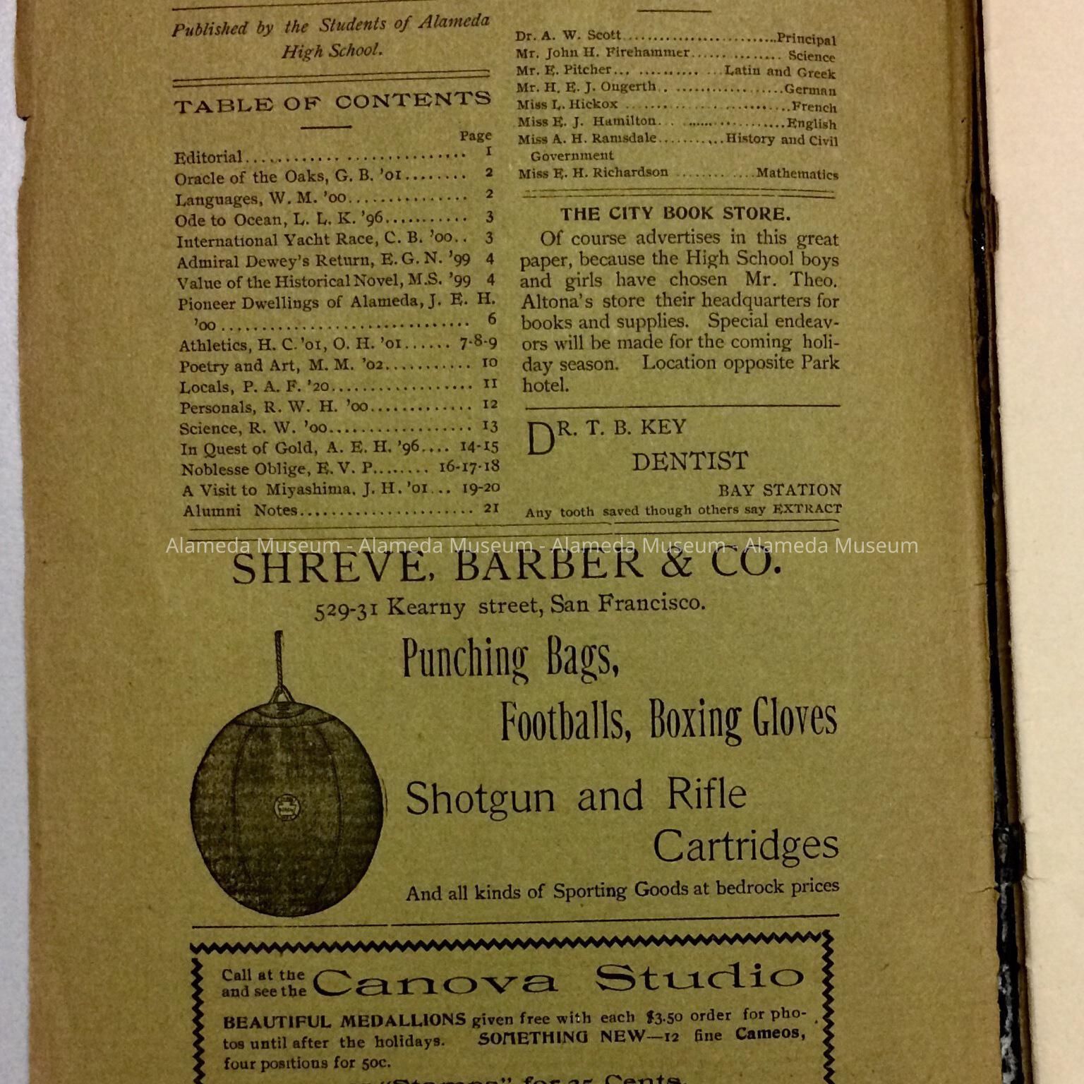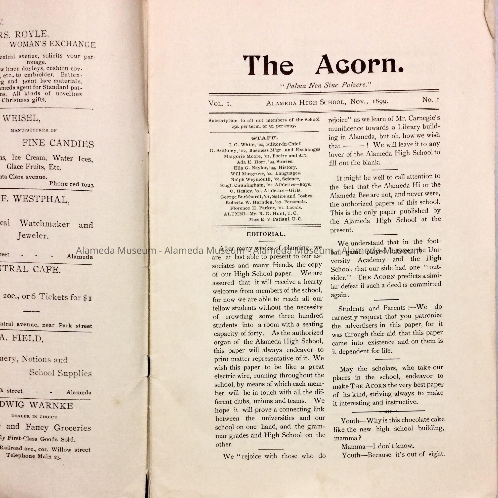 A NOVEMBER 1899 EDITION OF "THE ACORN," WHICH WAS A MONTHLY PUBLICATION WHICH EVOLVED (AT A LATER DATE) TO BECOME "THE ACORN" YEARBOOK FOR ALAMEDA HIGH SCHOOL. THE PUBLICATION ALSO INCLUDES ADVERTISEMENTS FOR LOCAL BUSINESSES. IT WAS "VOLUME #391."