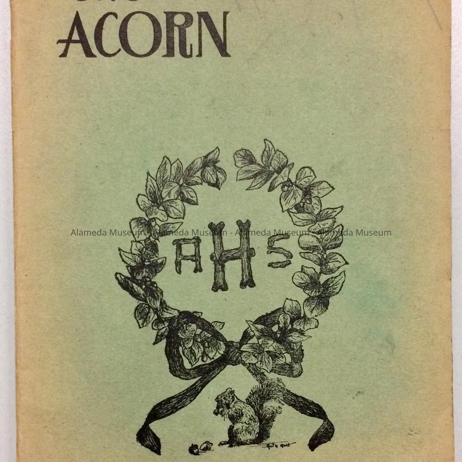A SOFT-BOUND BOOKLET, WITH COVER DESIGN FEATURING A WREATH OF ACORN, LEAVES, AND THE CAPTION, "THE ACORN," IN BLACK-COLORED TYPE ON A PALE GREEN-COLORED BACKGROUND.