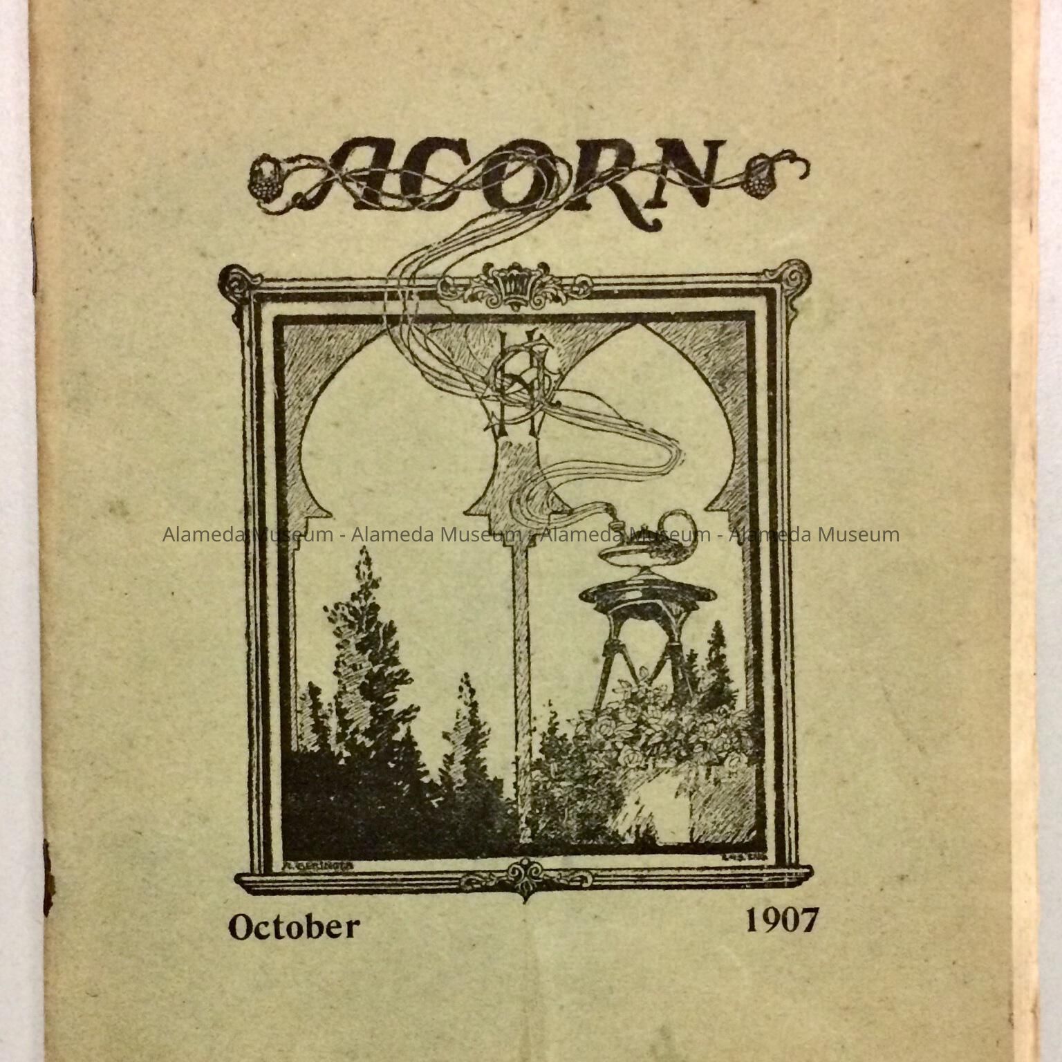 HISTORY OF OBJECT: AN OCTOBER 1907 COPY OF THE ALAMEDA HIGH SCHOOL "ACORN," ISSUED MONTHLY AND EVENTUALLY EVOLVED INTO THE "ACORN YEARBOOK" THAT WE KNOW TODAY. THE YEARBOOK WAS FOUND IN THE HOME OF ROBERT A. ROSE AT 1530 MOZART STREET, MARCUSE AND REMMEL DESIGN.