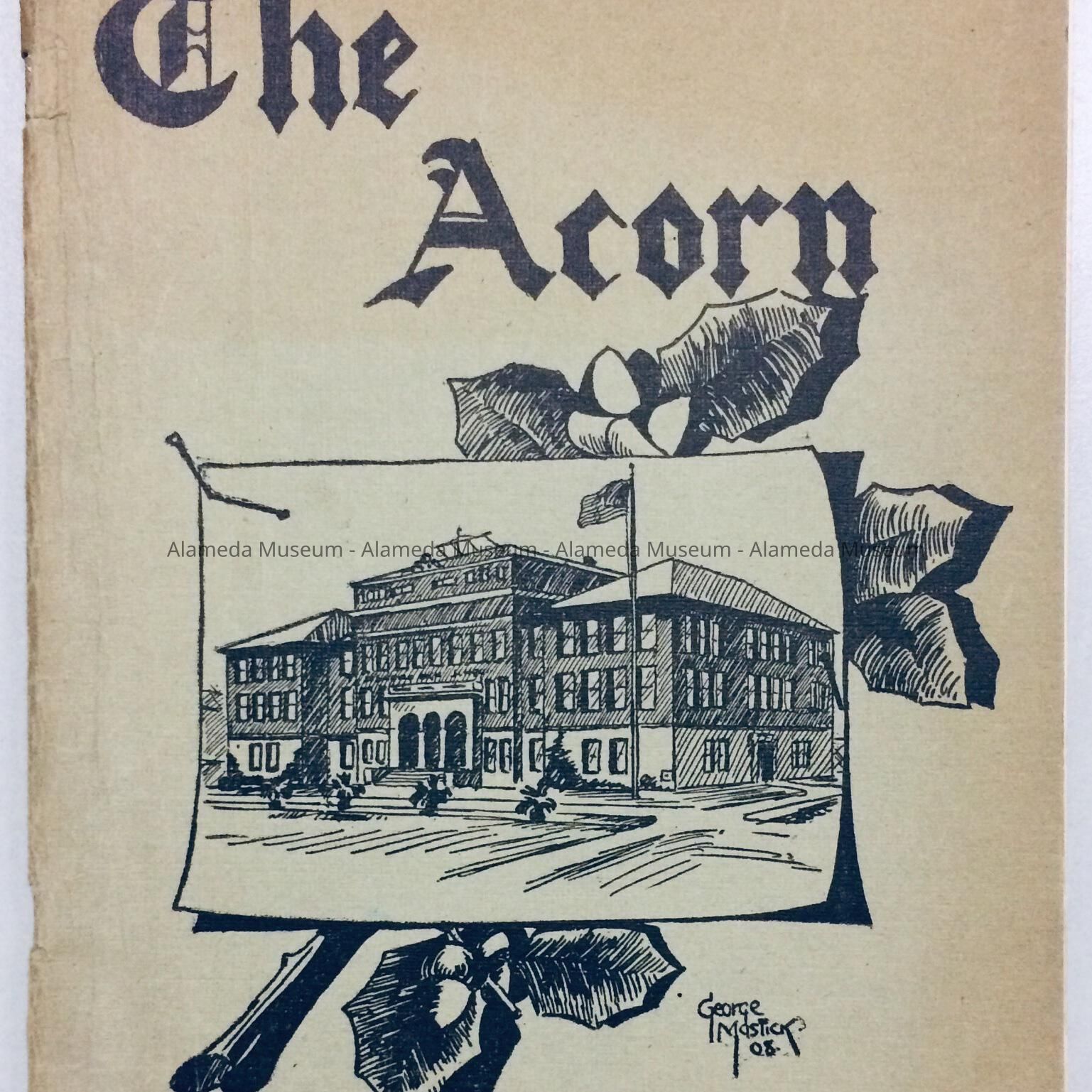 A SOFT-BOUND BOOKLET, WITH COVER DESIGN FEATURING A SKETCH OF THE ORIGINAL ALAMEDA HIGH SCHOOL LOCATED AT WALNUT STREET AND CENTRAL AVENUE; ERECTED IN 1902. THE ILLUSTRATION INCLUDES A CAPTION, "THE ACORN," IN BLACK-COLORED TYPE ON A BUFF-COLORED BACKGROUND.