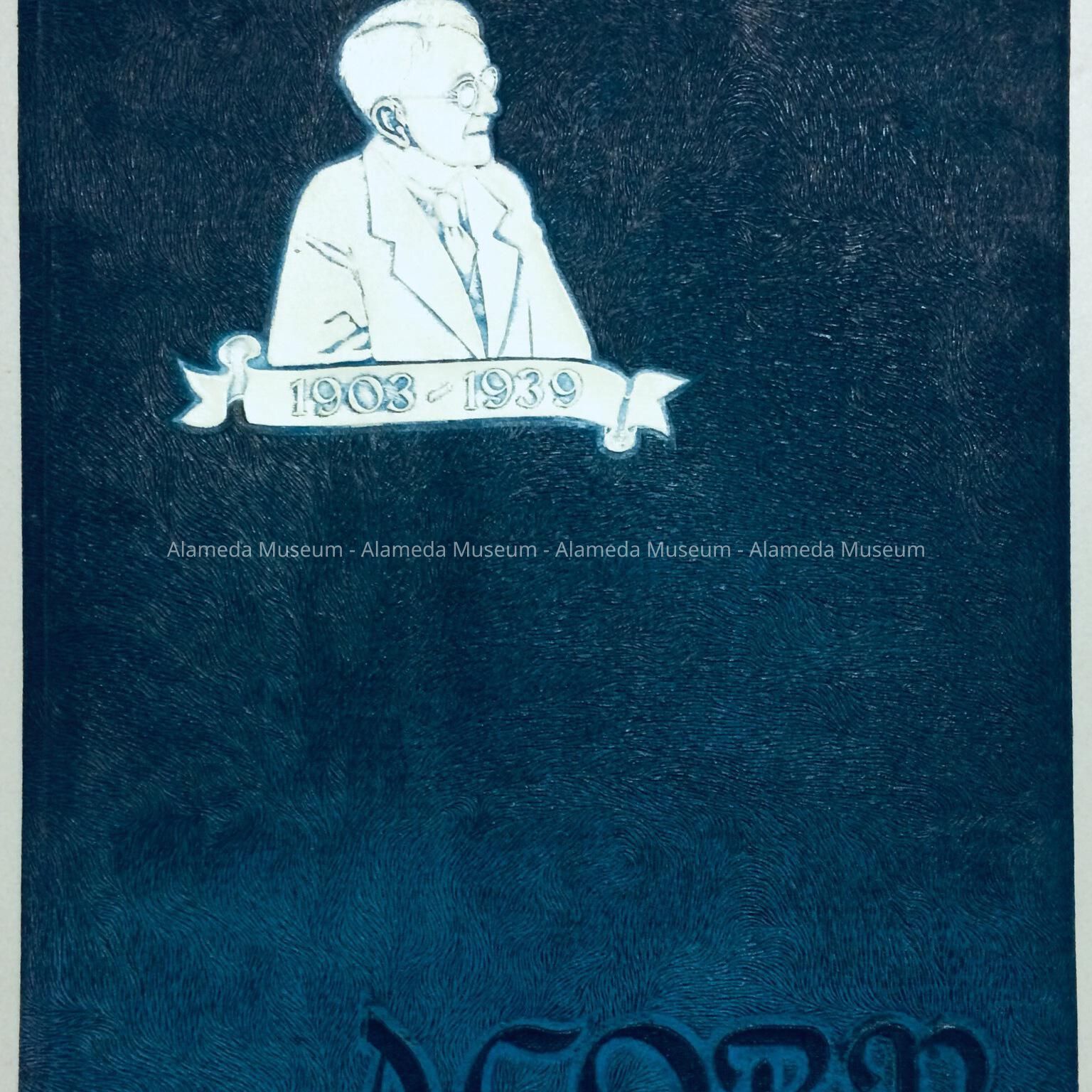 Description: Hard bound year book with cover design consisting of an embossed portrait of Dr. Geo. C. Thompson (principal of Alameda High School 1903 to 1939) and the caption "Acorn."