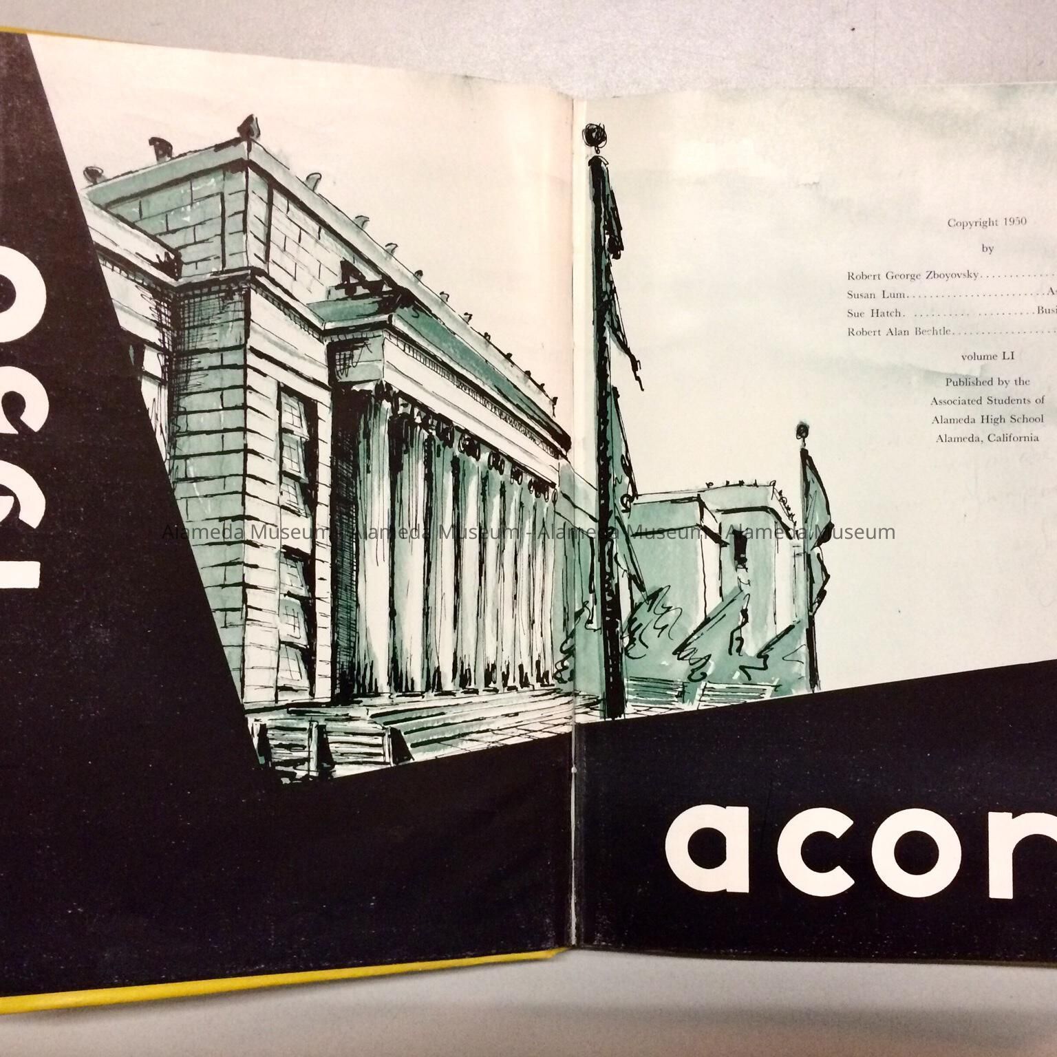 Illustrated copy of the Alameda High School yearbook, “Acorn” for 1950. Rear portion of book has ads for local businesses.
