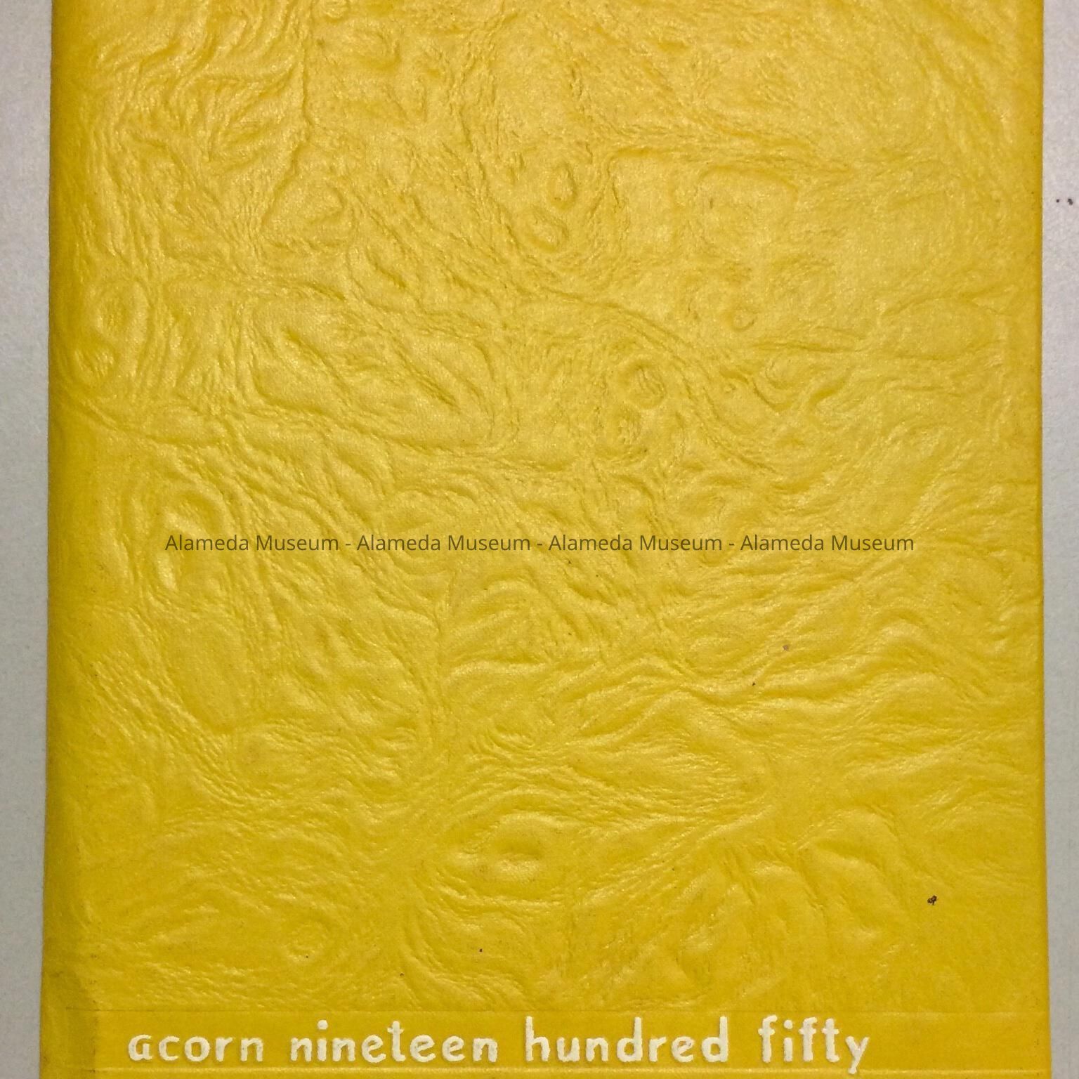 Hardbound book with cover of imitation leather. Cover has caption, “Acorn 1950” in white-colored type on a bright yellow-colored background.