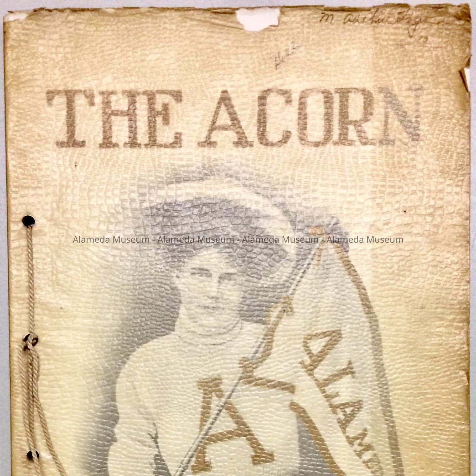 Description: A soft bound yearbook with illustrated cover design consisting of a girl holding a flag with the word "Alameda". Bold heading in gold colored type states "The Acorn".