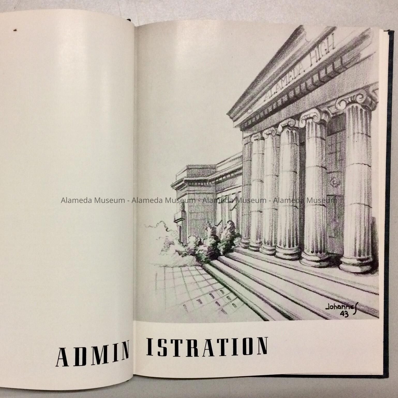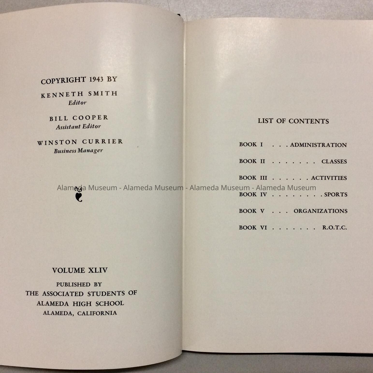 HISTORY OF OBJECT: A 1943 ALAMEDA HIGH SCHOOL YEARBOOK THAT ORIGINALLY BELONGED TO FRANK PERKINS, MEMBER OF A PIONEER WEST END ALAMEDA FAMILY.