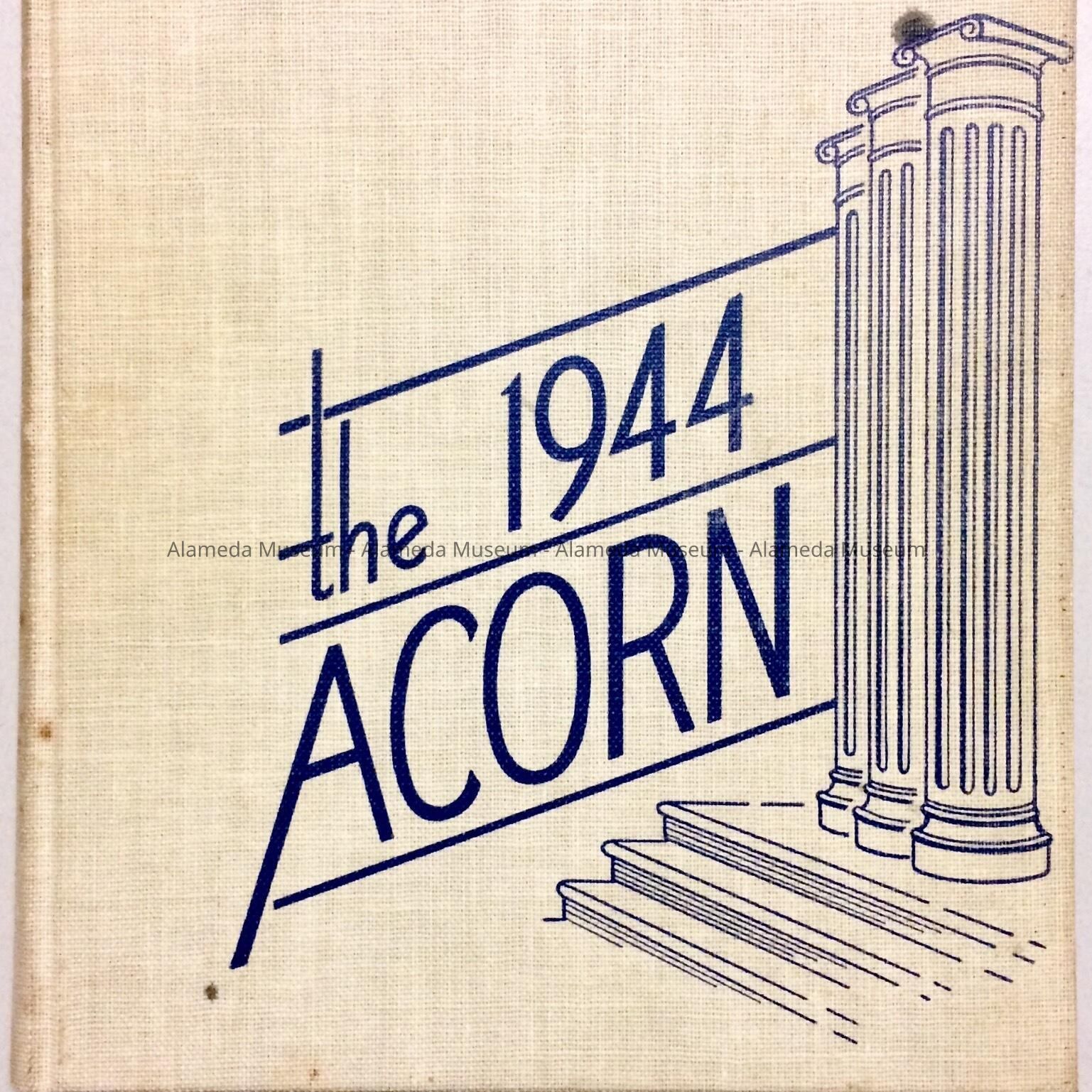 HISTORY OF OBJECT: A 1944 THE ACORN YEARBOOK, ALAMEDA HIGH SCHOOL, WHICH WAS ORIGINALLY OWNED BY FRANK PERKINS, MEMBER OF A WEST END ALAMEDA PIONEER FAMILY.