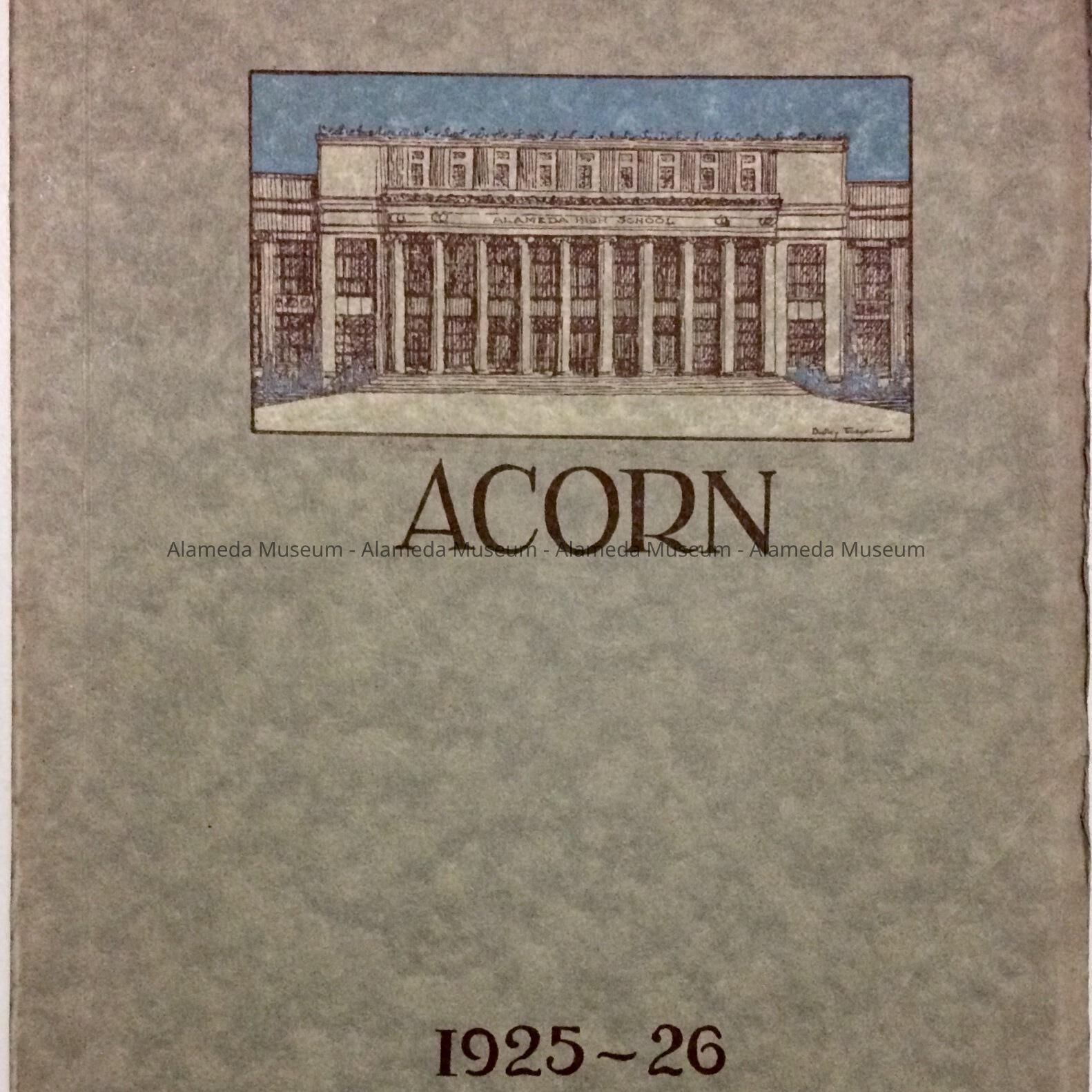 A SOFT-BOUND YEARBOOK, WITH COVER DESIGN FEATURING A DRAWING OF THE MAIN ENTRANCE OF ALAMEDA HIGH SCHOOL AND THE WORD, "ACORN," IN BROWN-COLORED TYPE ON A GREY-COLORED BACKGROUND.