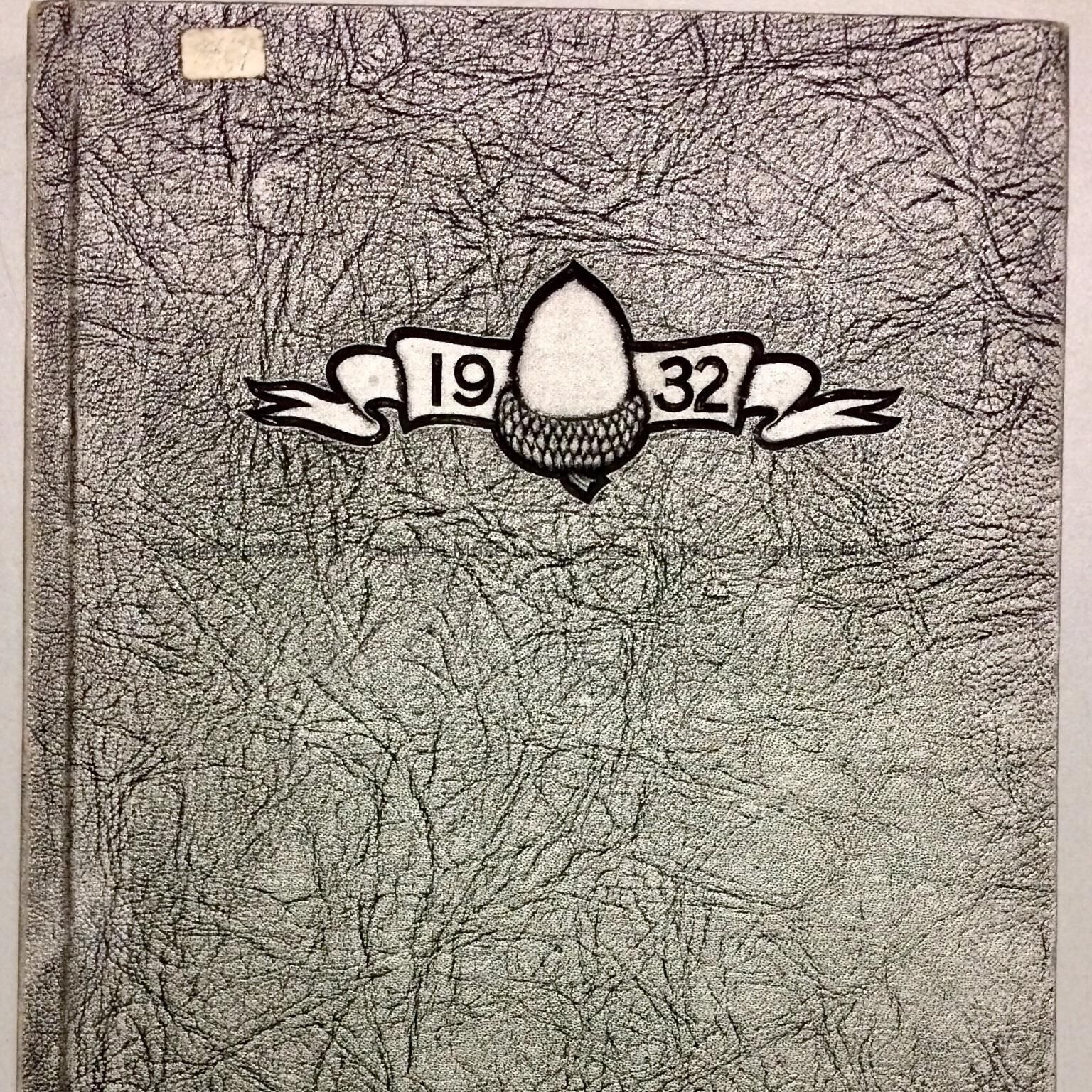 Description: Hardbound book with a buckram cover and imitation leather with gray and black designs. The cover has an embossed acorn design and the date 1932.
