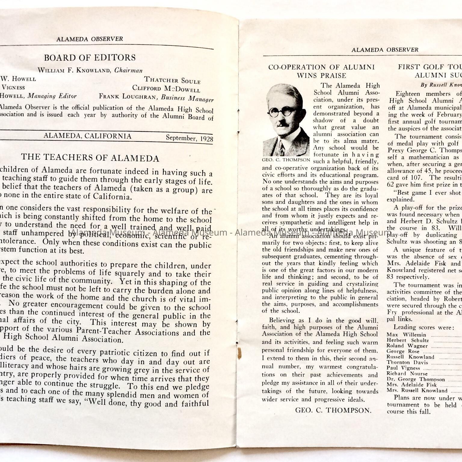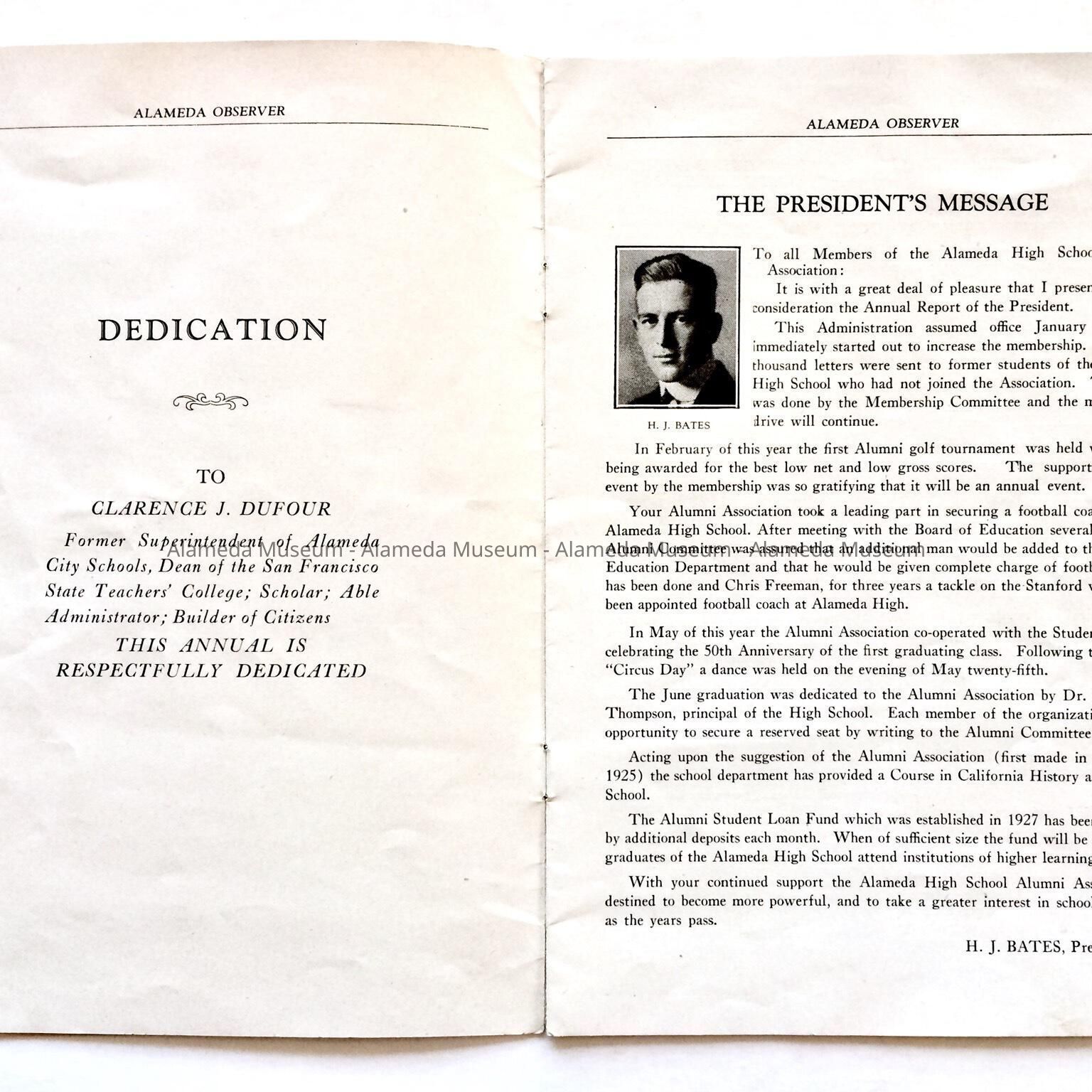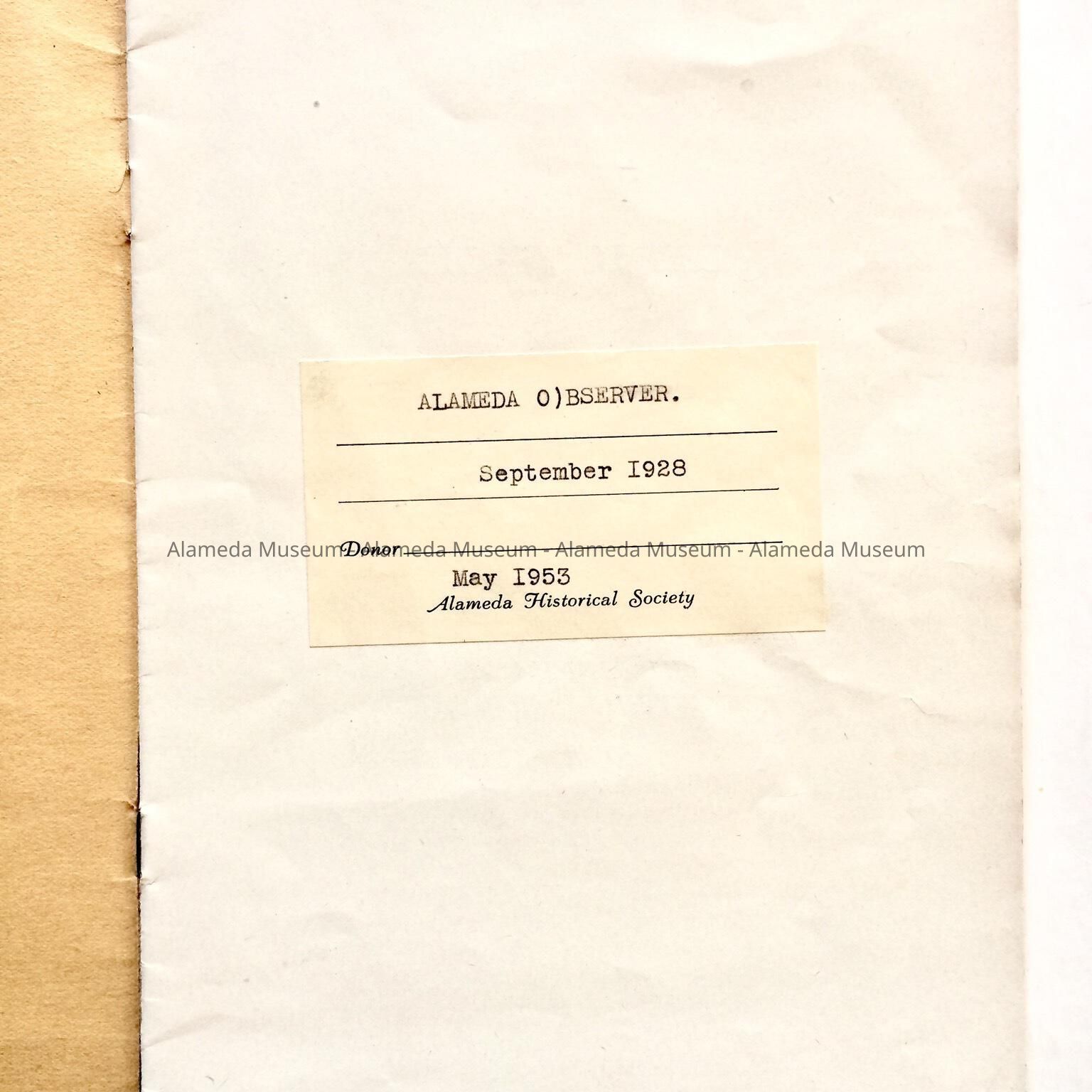 Booklet entitled, “Alameda Observer” put out by the Alumni Association of the Alameda High School. Also included is a membership roll of members and their addresses. Donated to Alameda Historical Society in May 1953, numbered 332, and never catalogued.