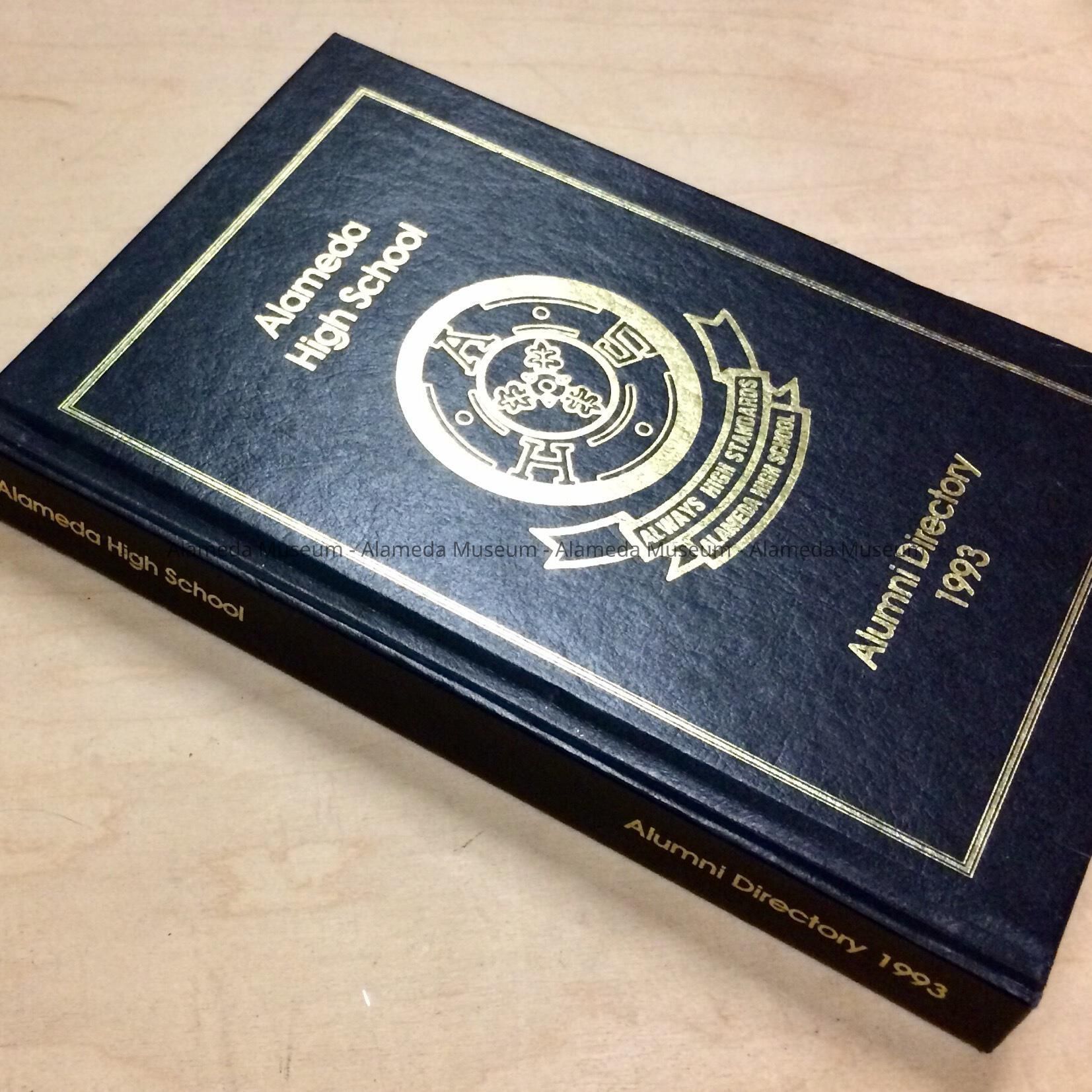 A HARD-BOUND BOOK, WITH COVER OF IMITATION BLACK - COLORED LEATHER. COVER BEARS THE CAPTION, "ALAMEDA HIGH SCHOOL ALUMNI DIRECTORY, 1993," IN GOLD-COLORED TYPE.
