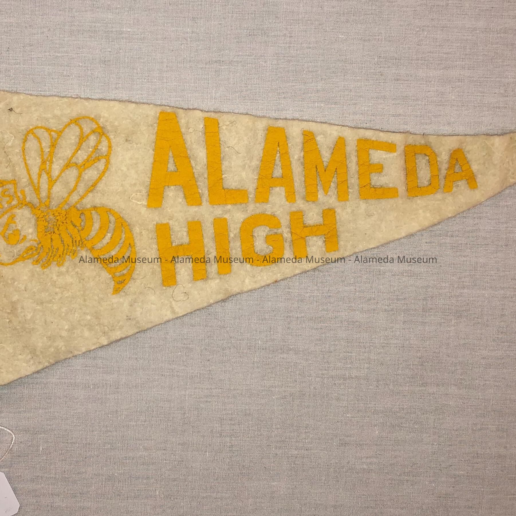 TRIANGULAR-SHAPED BANNER, MADE OF GOLD- AND WHITE-COLORED FELT, WITH PRINTED CAPTION, "ALAMEDA HIGH" IN GOLD-COLORED TYPE.