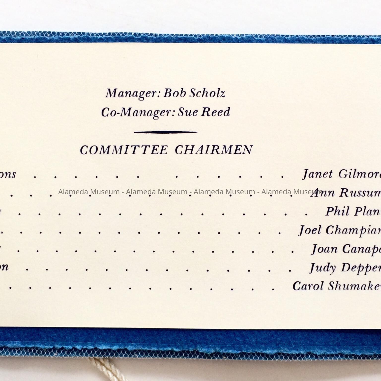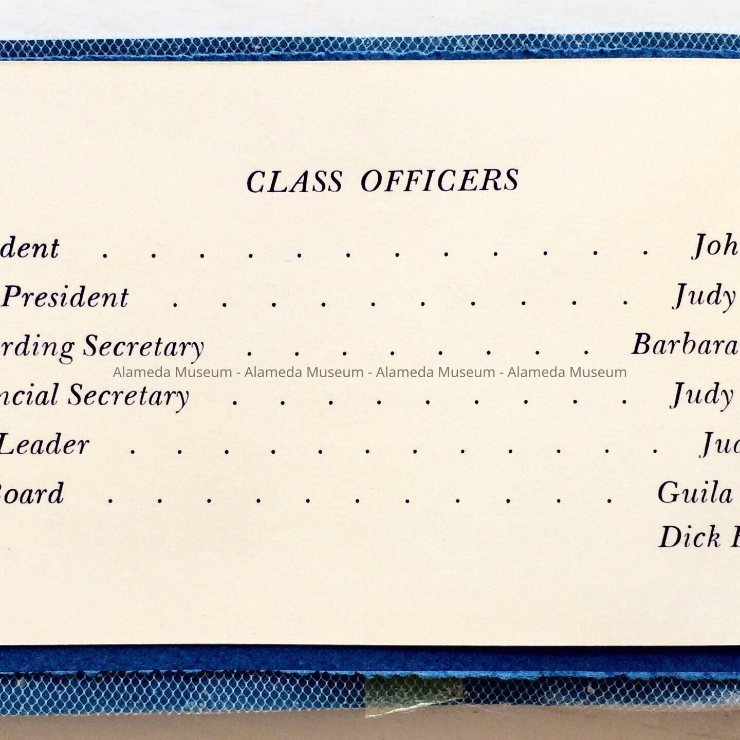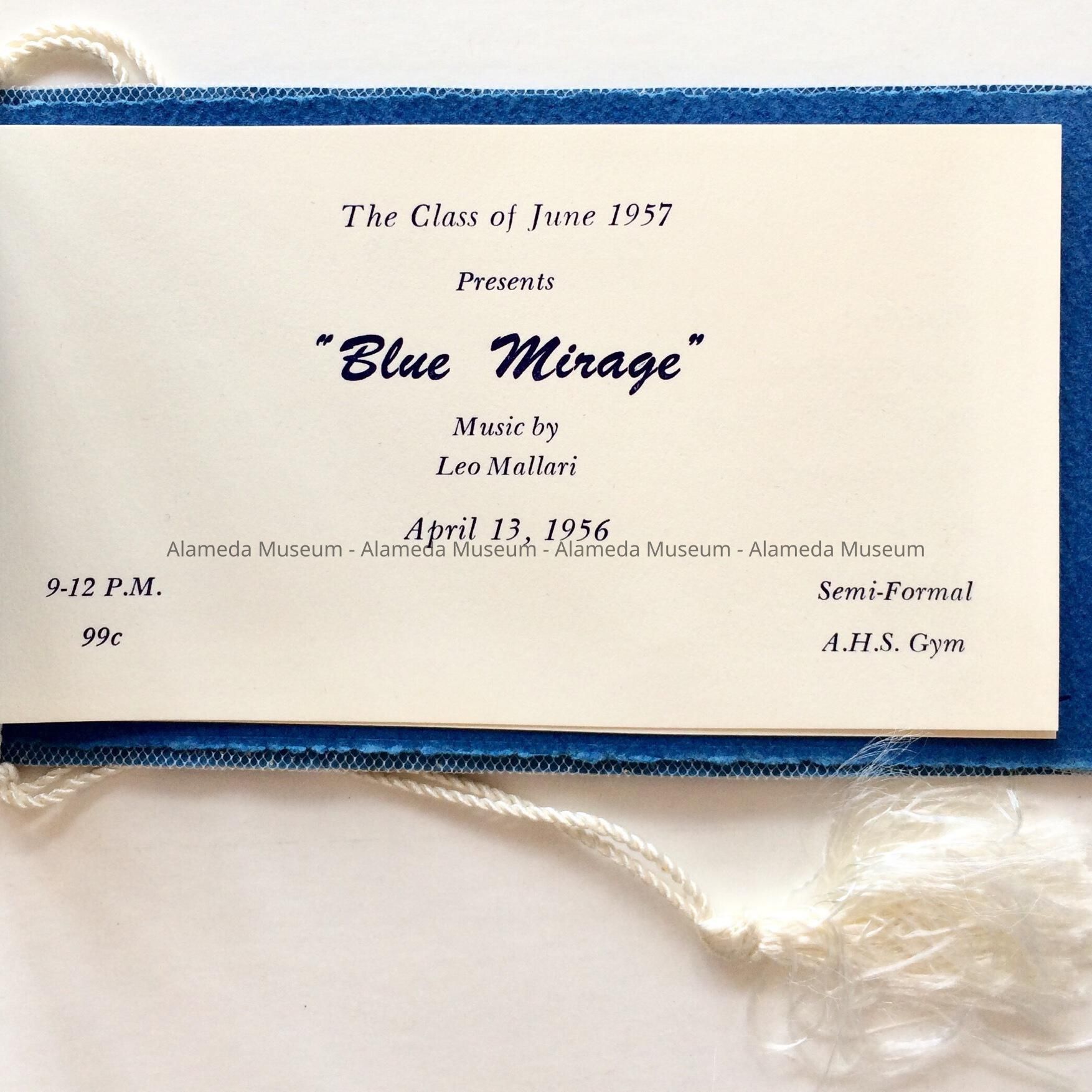 DANCE CARD FOR THE HIGH SCHOOL DANCE, ENTITLED, "BLUE MIRAGE," HELD ON APRIL 13, 1956, FOR THE ALAMEDA HIGH SCHOOL CLASS OF JUNE 1957.