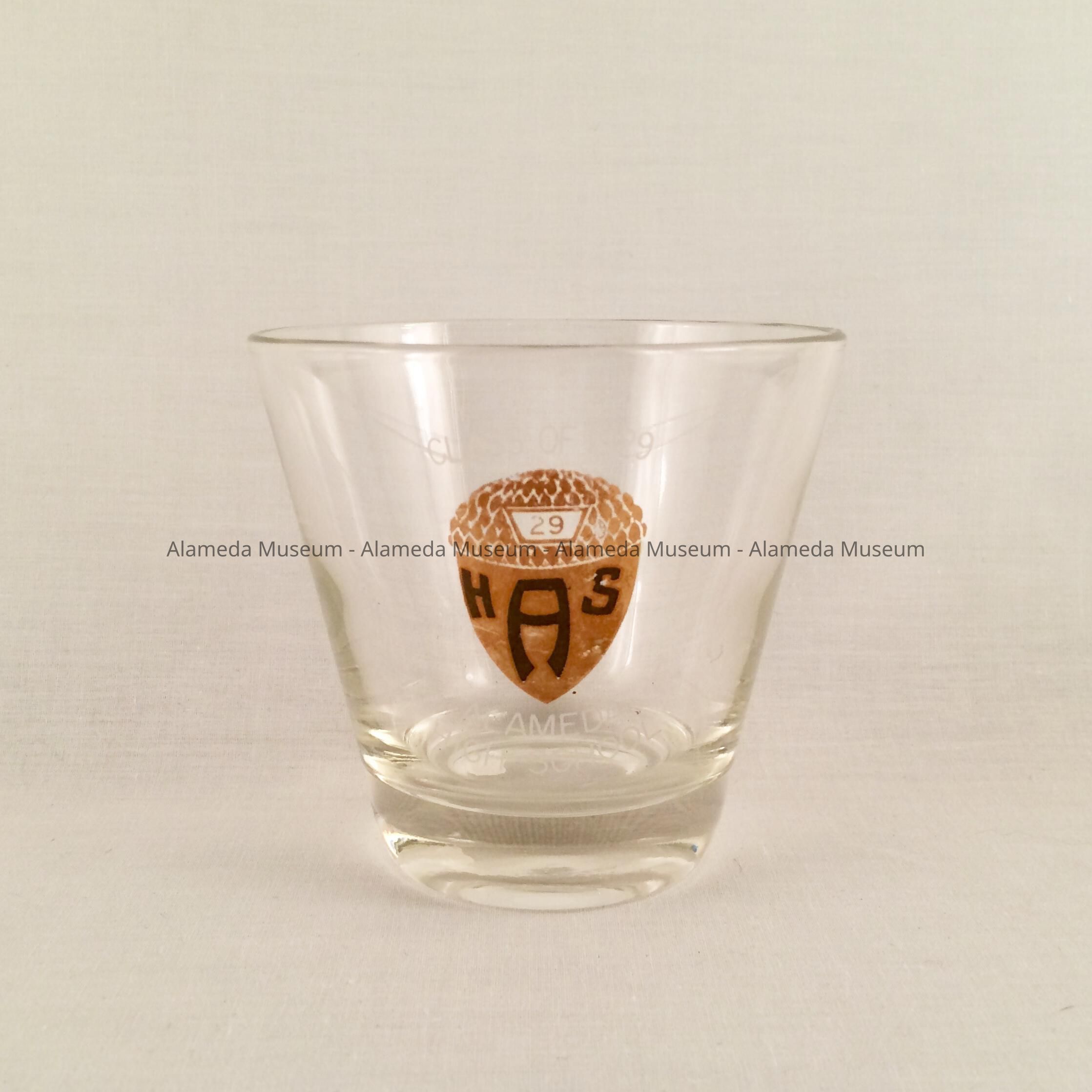 Description: Clear whiskey glass with gold-embossed design of an Acorn, on which the letters A (center) H (left) and S (right) are raised in a lighter color, and with white letters stating 'Class of 1929', 'Alameda High School'.