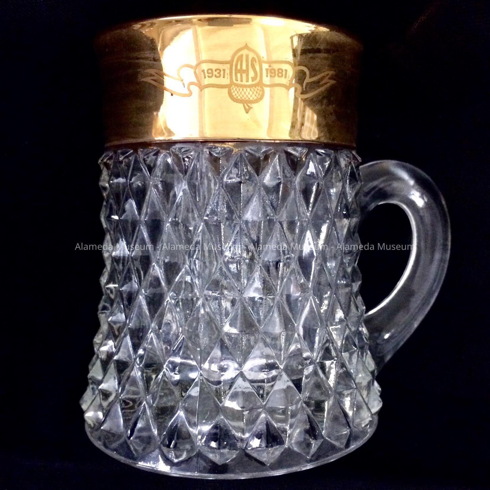 Pressed clear-glass handled mug. Mug has upper section of rim with a gold-leaf band. Band has caption of stylized acorn and banner with the initials, "AHS 1931-1981."