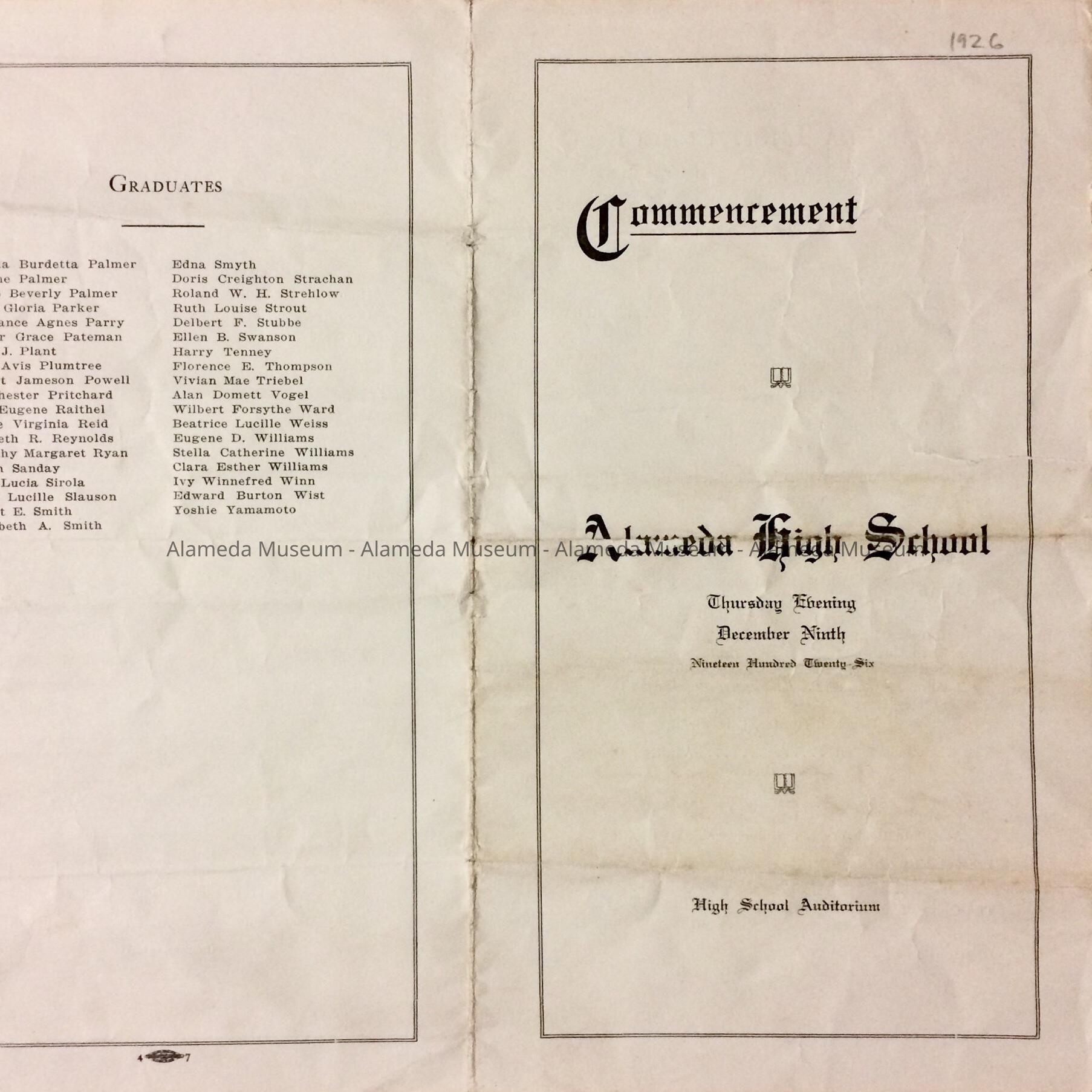 History of Object: The program for the commencement exercises at Alameda High School in 1926.