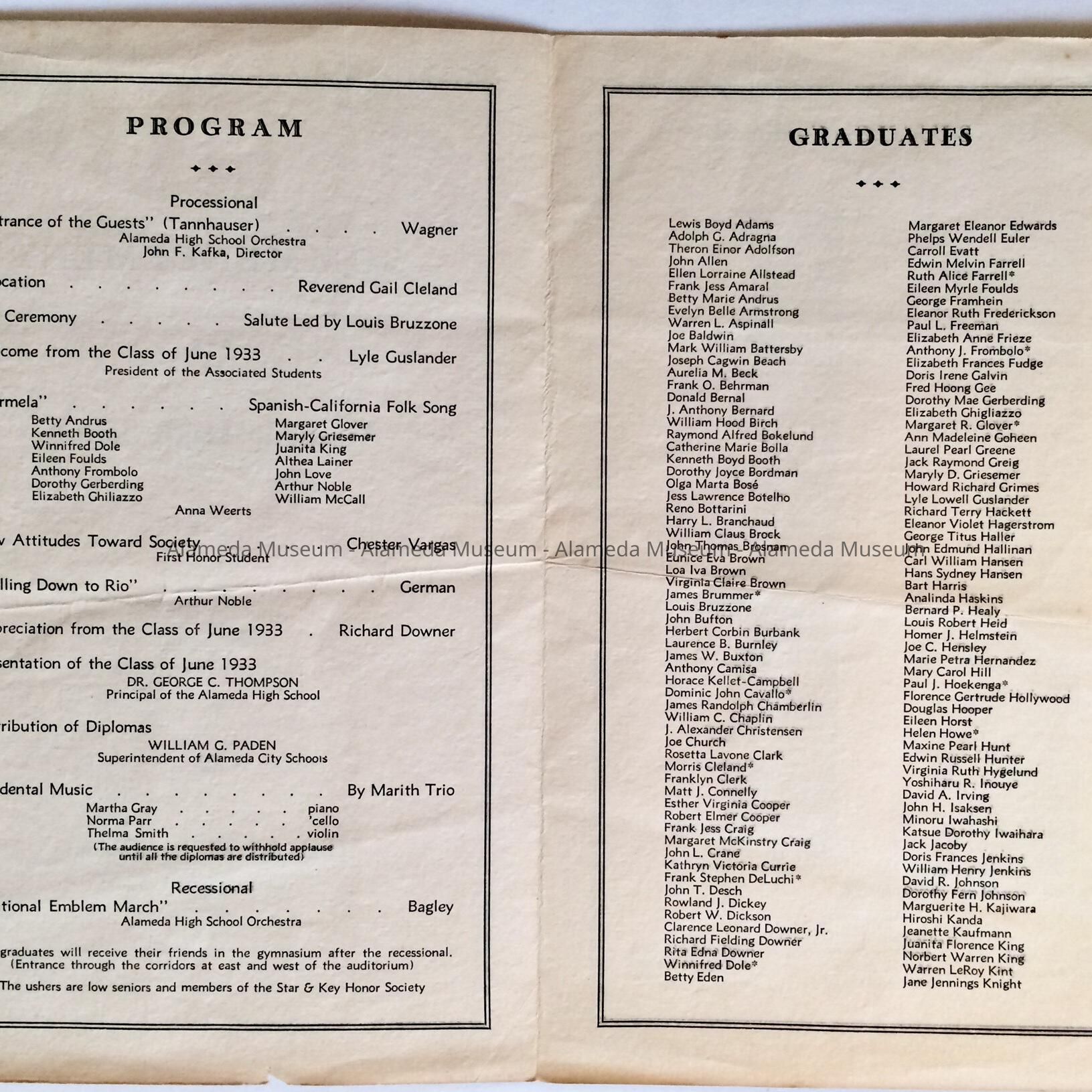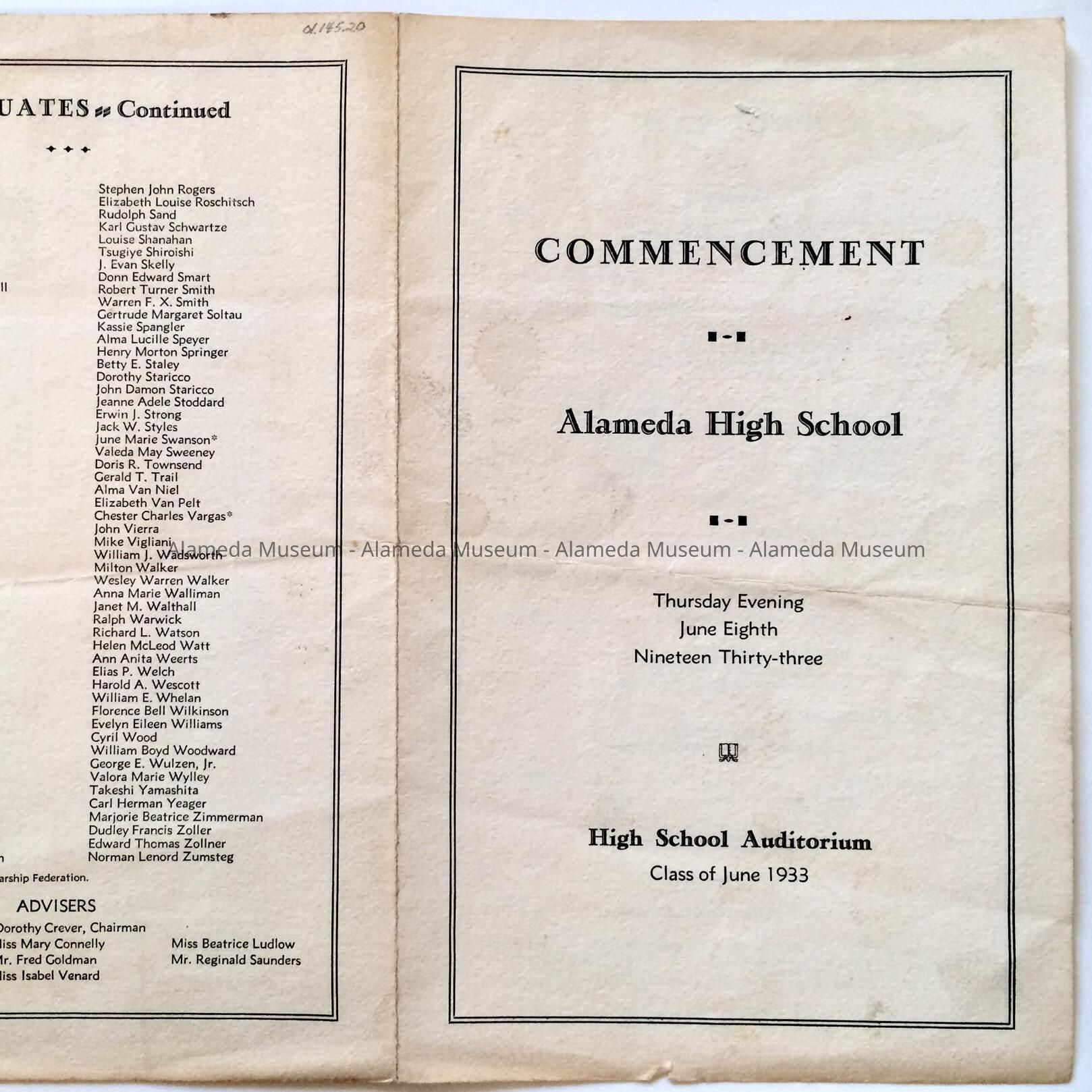 Description: 4-page program with caption: "Commencement", "Alameda High School", "Thursday Evening June Eight Nineteen Thirty-three" and "High School Auditorium", "Class of June 1933".