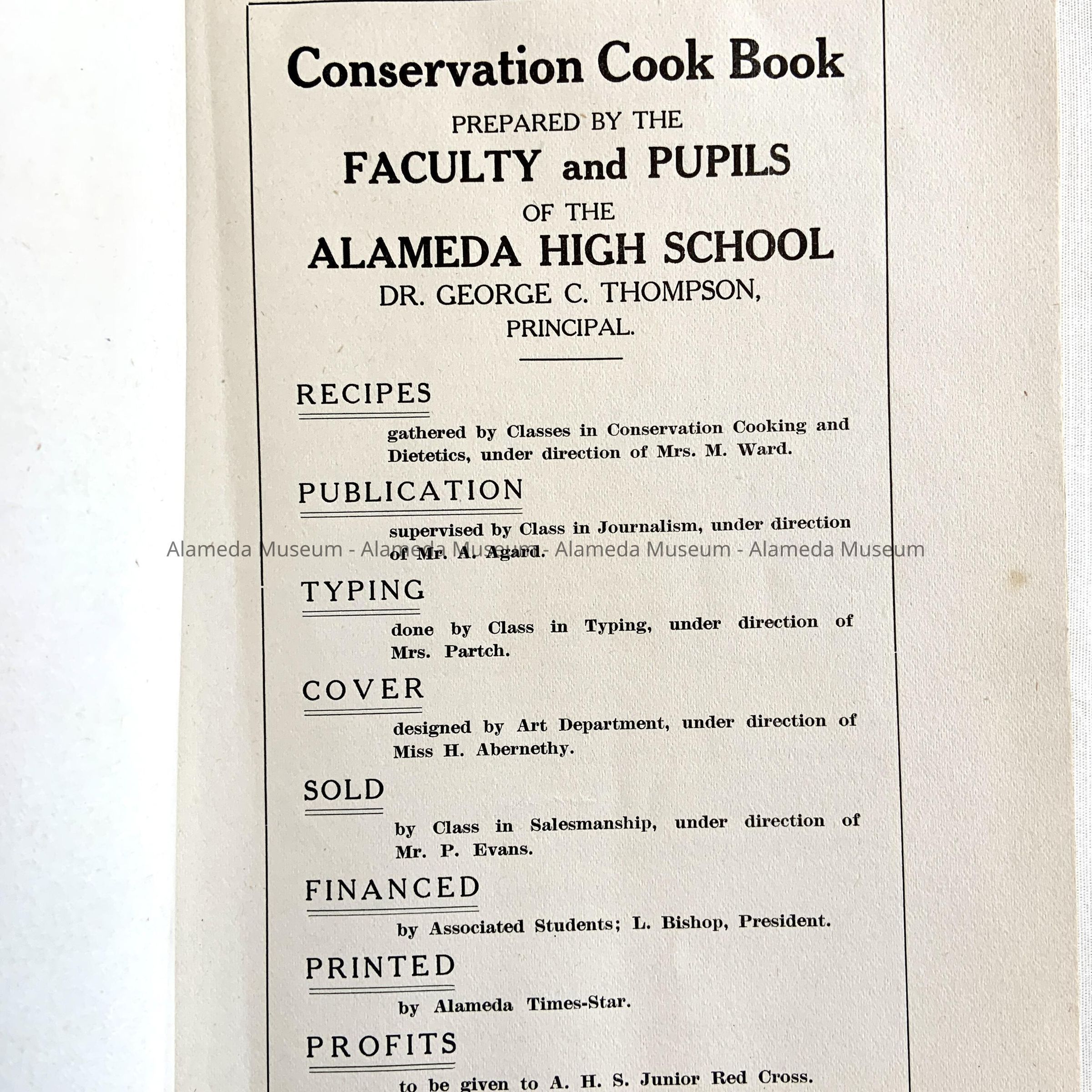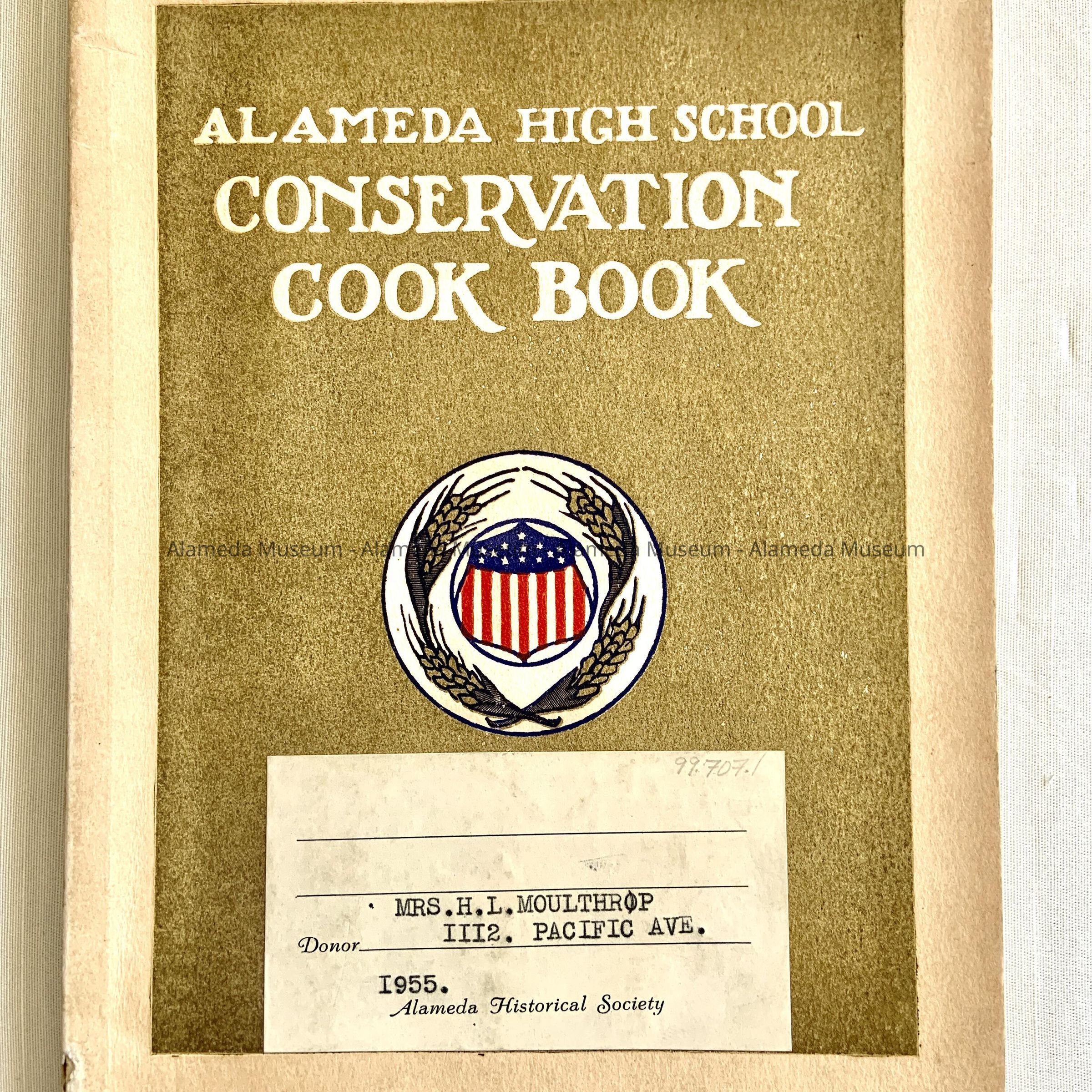 History: Book entitled Conservation Cook Book prepared by the faculty and pupils of Alameda High School during World War I.