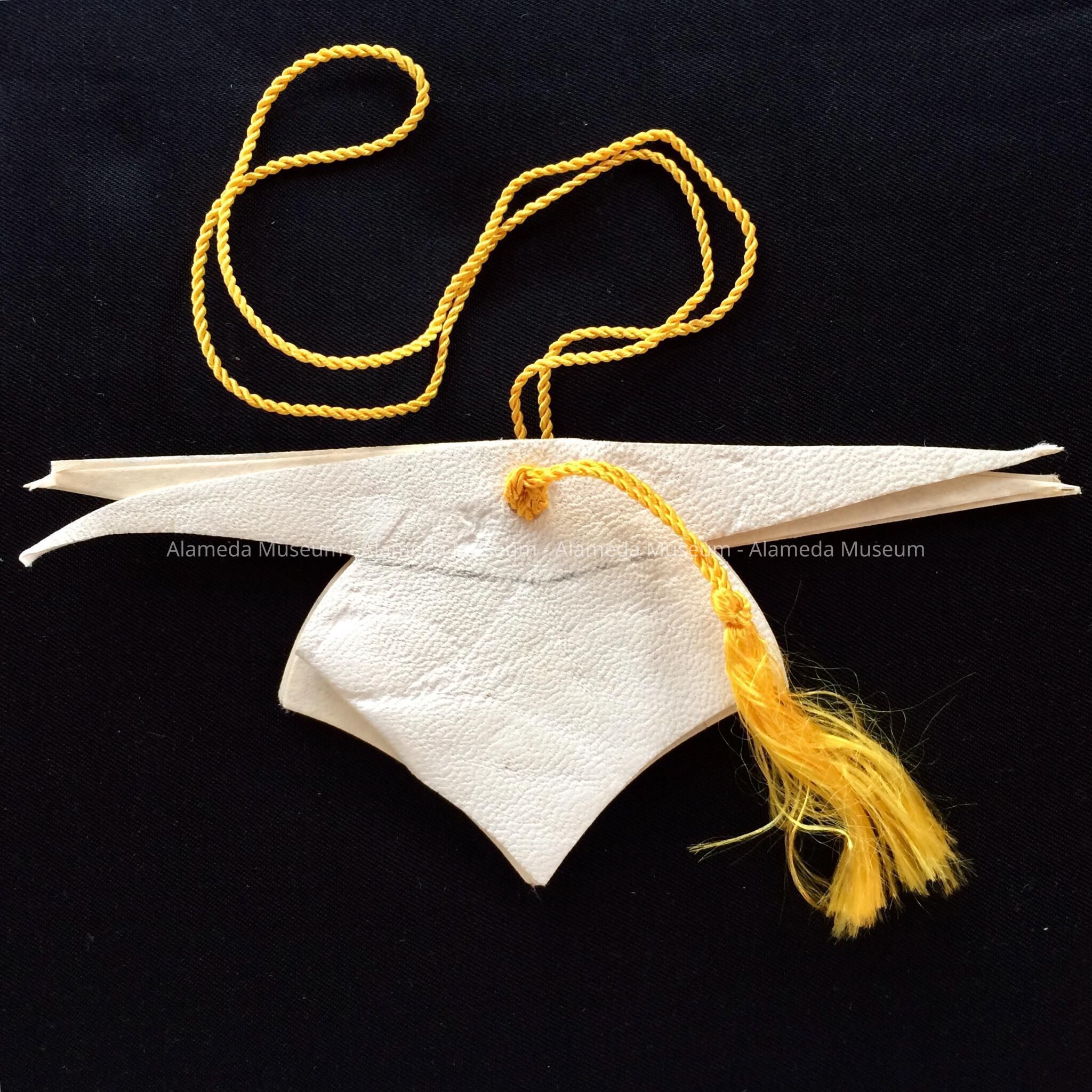 DANCE CARD IN THE SHAPE OF A GRADUATING CAP, WITH COVER OF WHITE-COLORED KID, STRUNG WITH A GOLD-COLORED RIBBON.