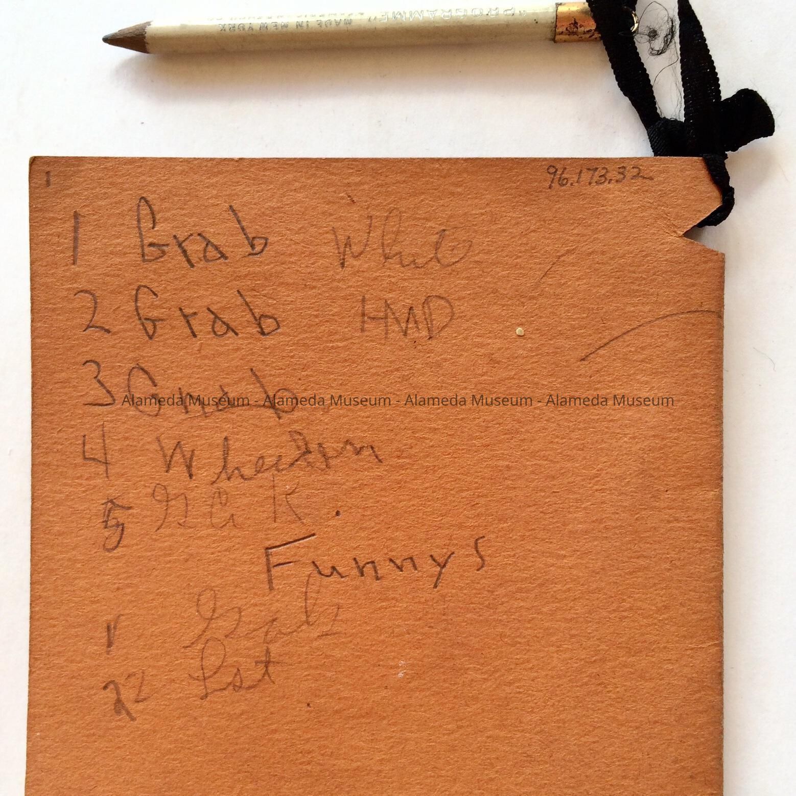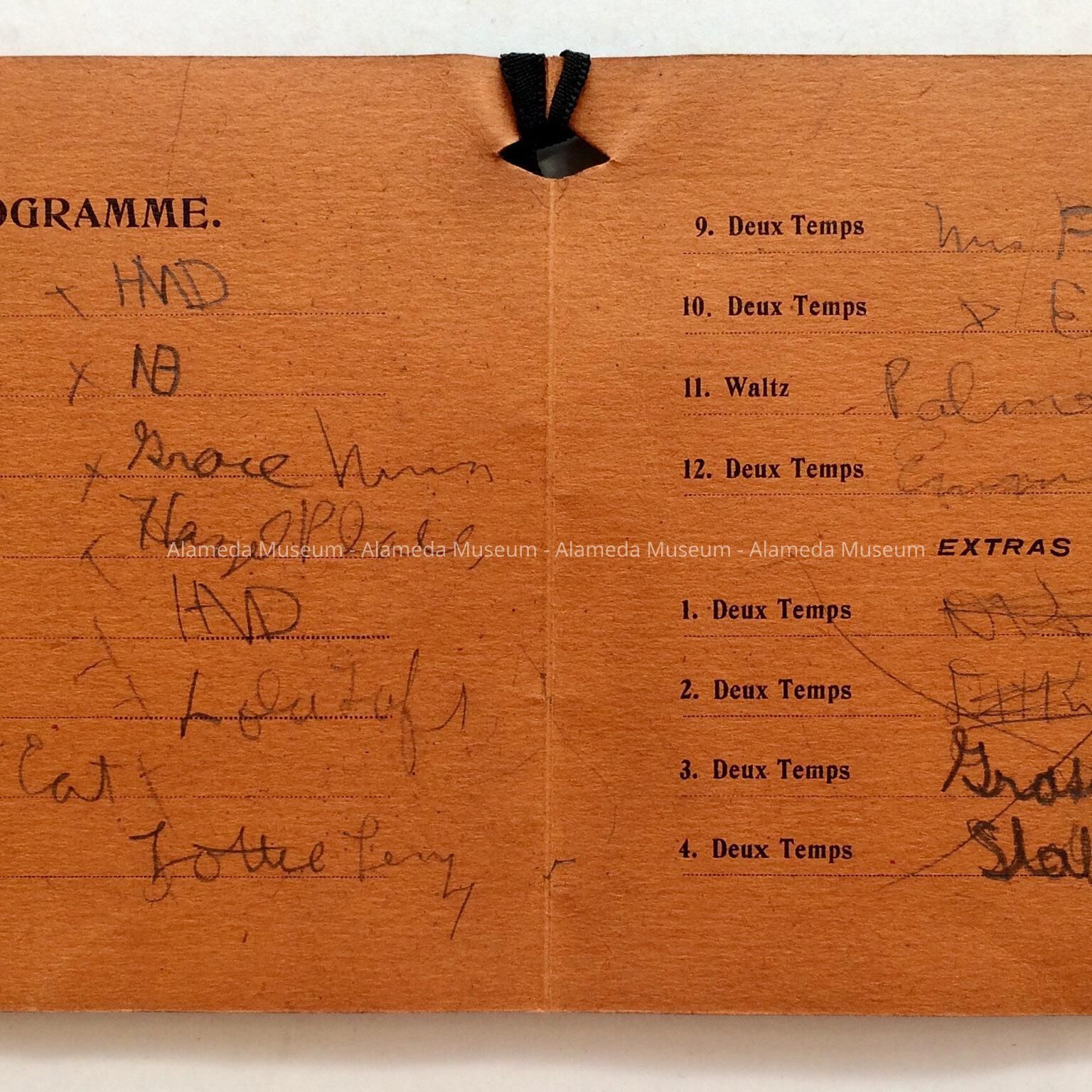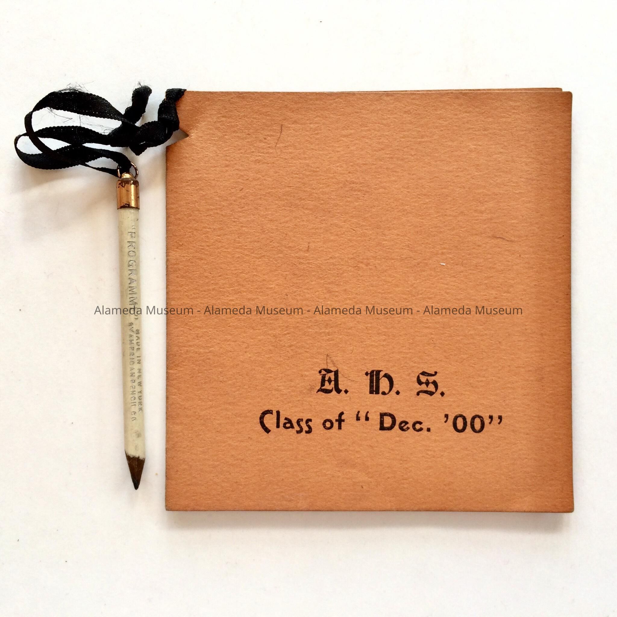 DANCE PROGRAM ON ORANGE-COLORED HEAVY PAPER STOCK, WITH LEAD PENCIL ATTACHED BY A SILK RIBBON. BOLD-PRINTED CAPTION, "ALAMEDA HIGH SCHOOL, CLASS OF DECEMBER 1900" ON COVER.