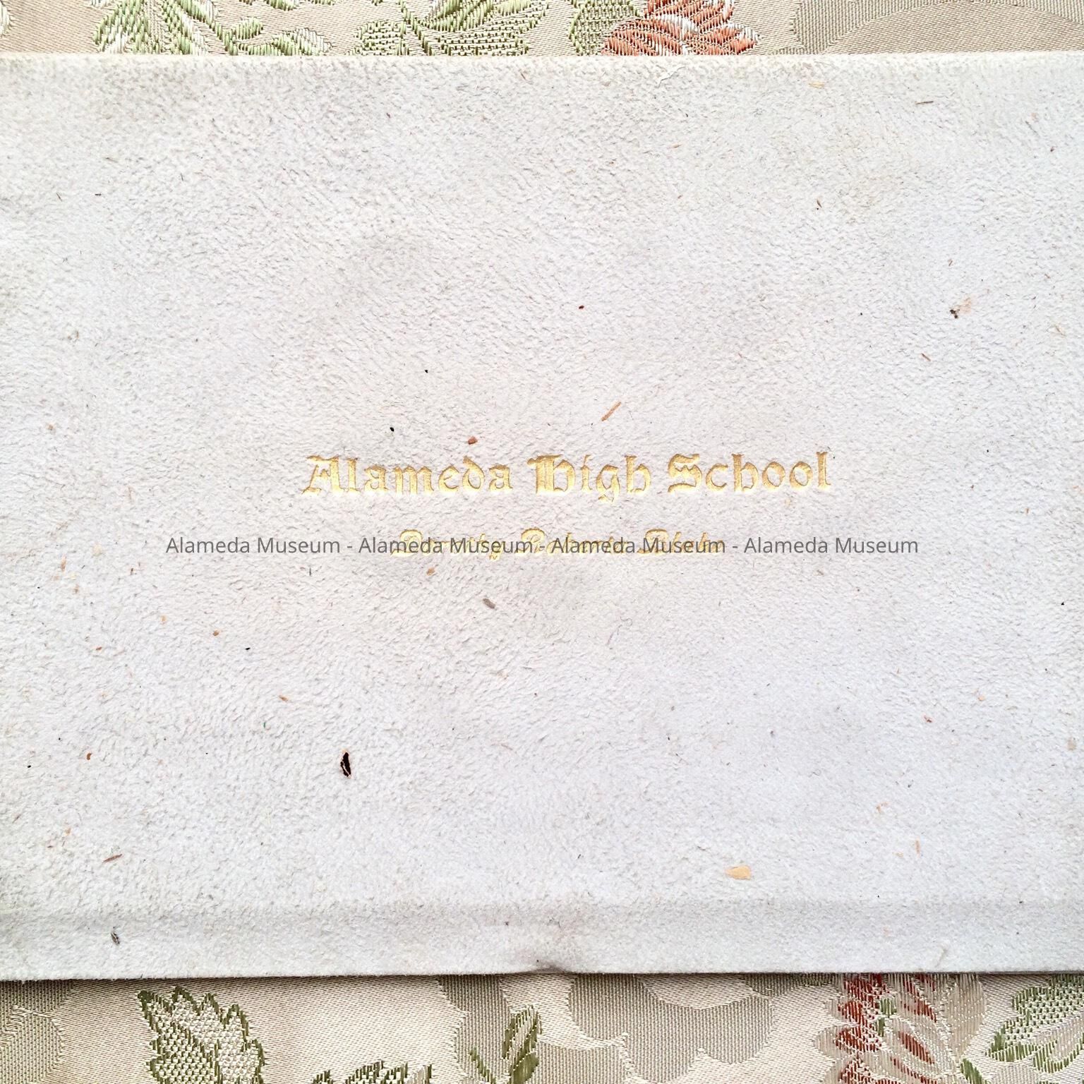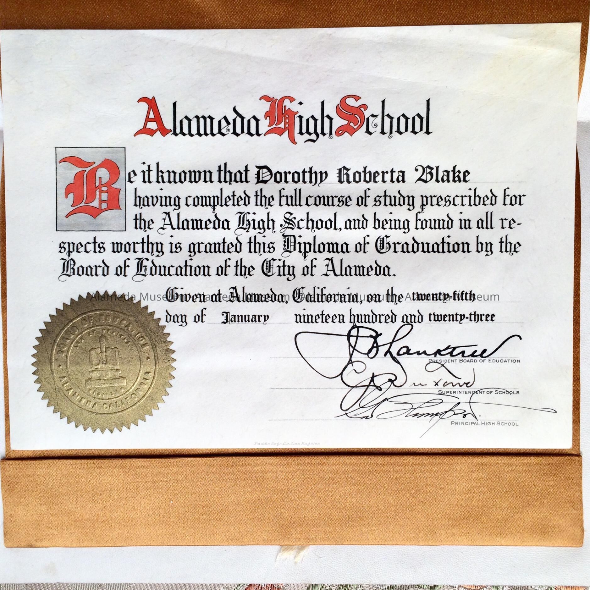 DIPLOMA AND COVERLET: DIPLOMA PRINTED ON IMITATION PARCHMENT PAPER IN ELABORATE RED- AND BLACK-COLORED TYPE. DIPLOMA HAS EMBOSSED GOLD SEAL. DOCUMENT HOUSED IN WHITE KID COVERLET LINED IN GOLD-COLORED SILK. COVER OF COVERLET IN GOLD INCISED LETTERS STATES, "ALAMEDA HIGH SCHOOL, DOROTHY ROBERTA BLAKE."