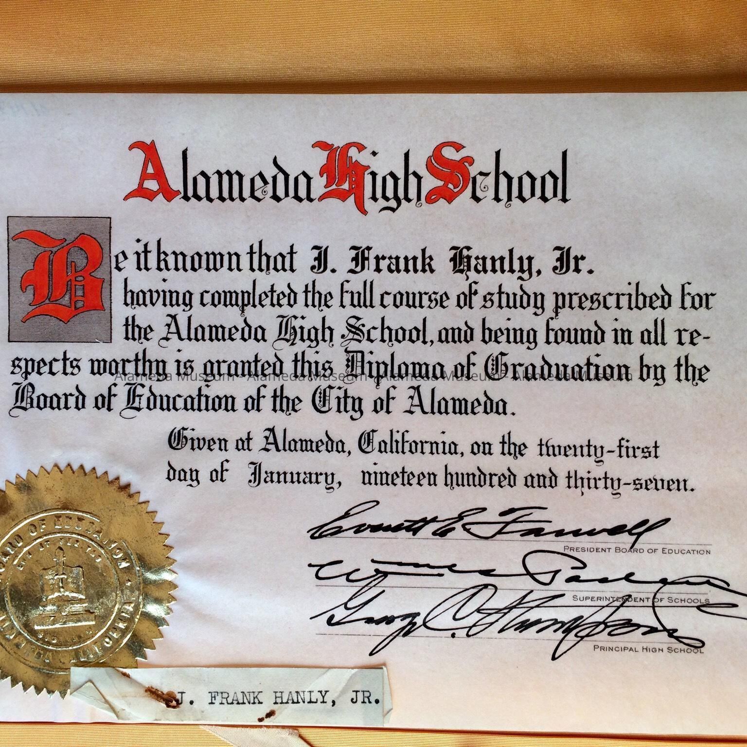 HIGH SCHOOL DIPLOMA OF THE LATE JACK HANLY, LONG-TIME RESIDENT OF ALAMEDA AND HUSBAND OF THE DONOR.