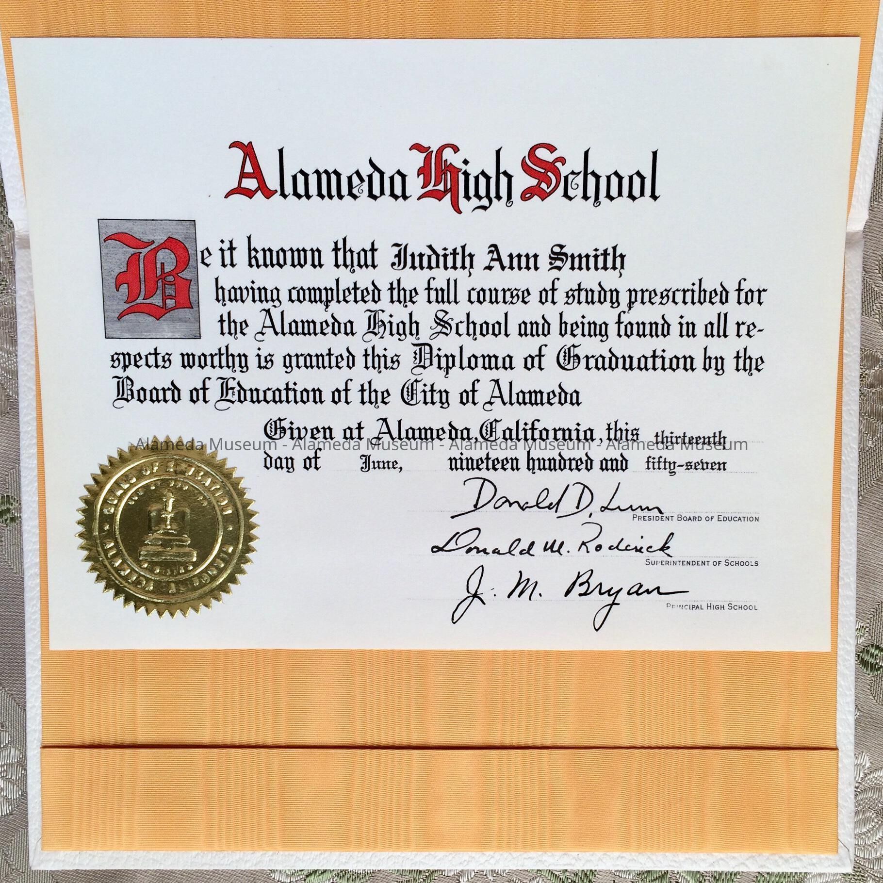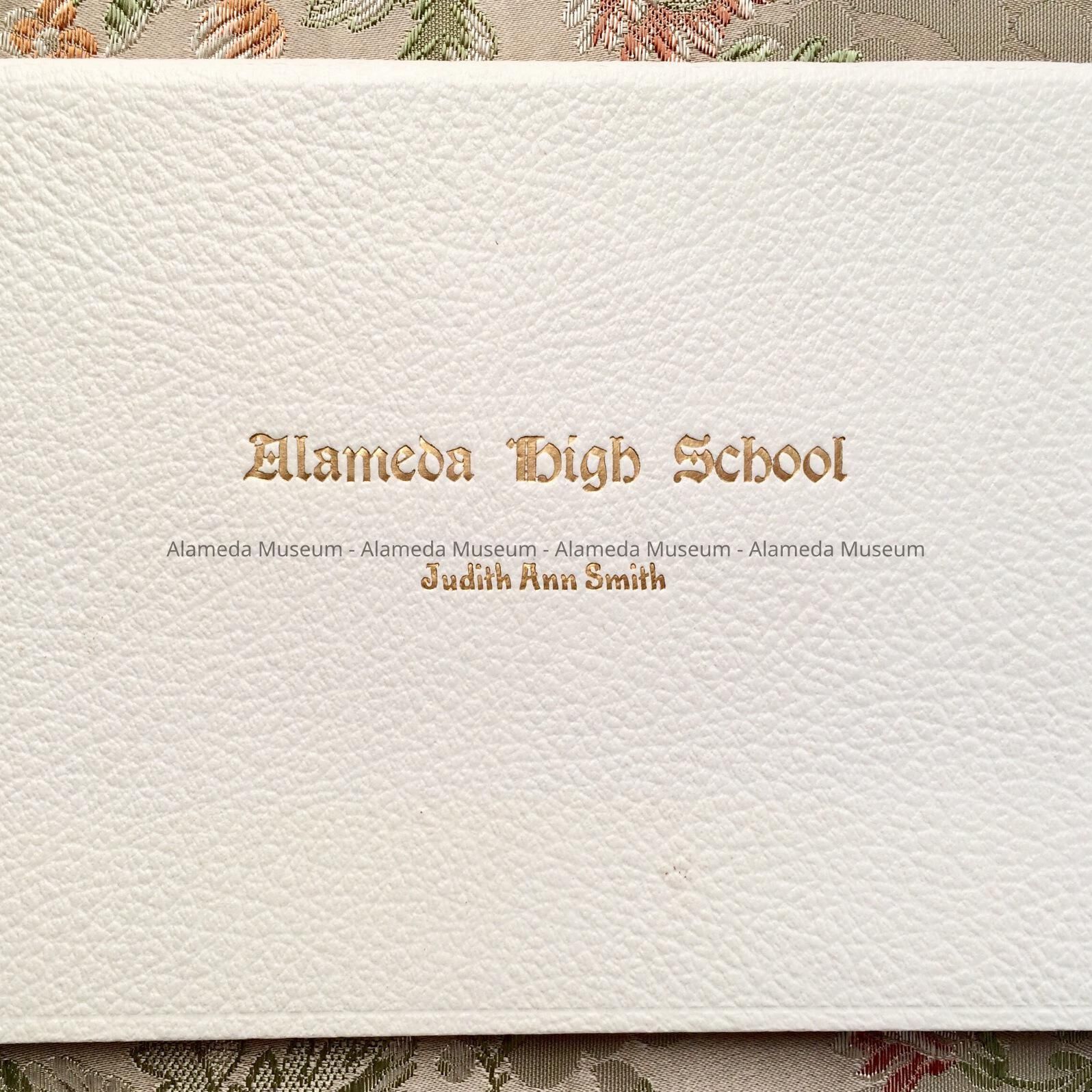 ELABORATELY PRINTED DIPLOMA ON IMITATION PARCHMENT. BOLD-PRINTED CAPTION, "ALAMEDA HIGH SCHOOL, " APPEARS IN RED-AND-BLACK-COLORED TYPE. DIPLOMA IS HOUSED IN ITS ORIGINAL JACKET OF IMITATION WHITE-COLORED LEATHER. JACKET IS LINED IN GOLD-COLORED MOIRE SATIN, WITH THE CAPTION, "ALAMEDA HIGH SCHOOL, JUDITH ANN SMITH," IN GOLD-COLORED TYPE.