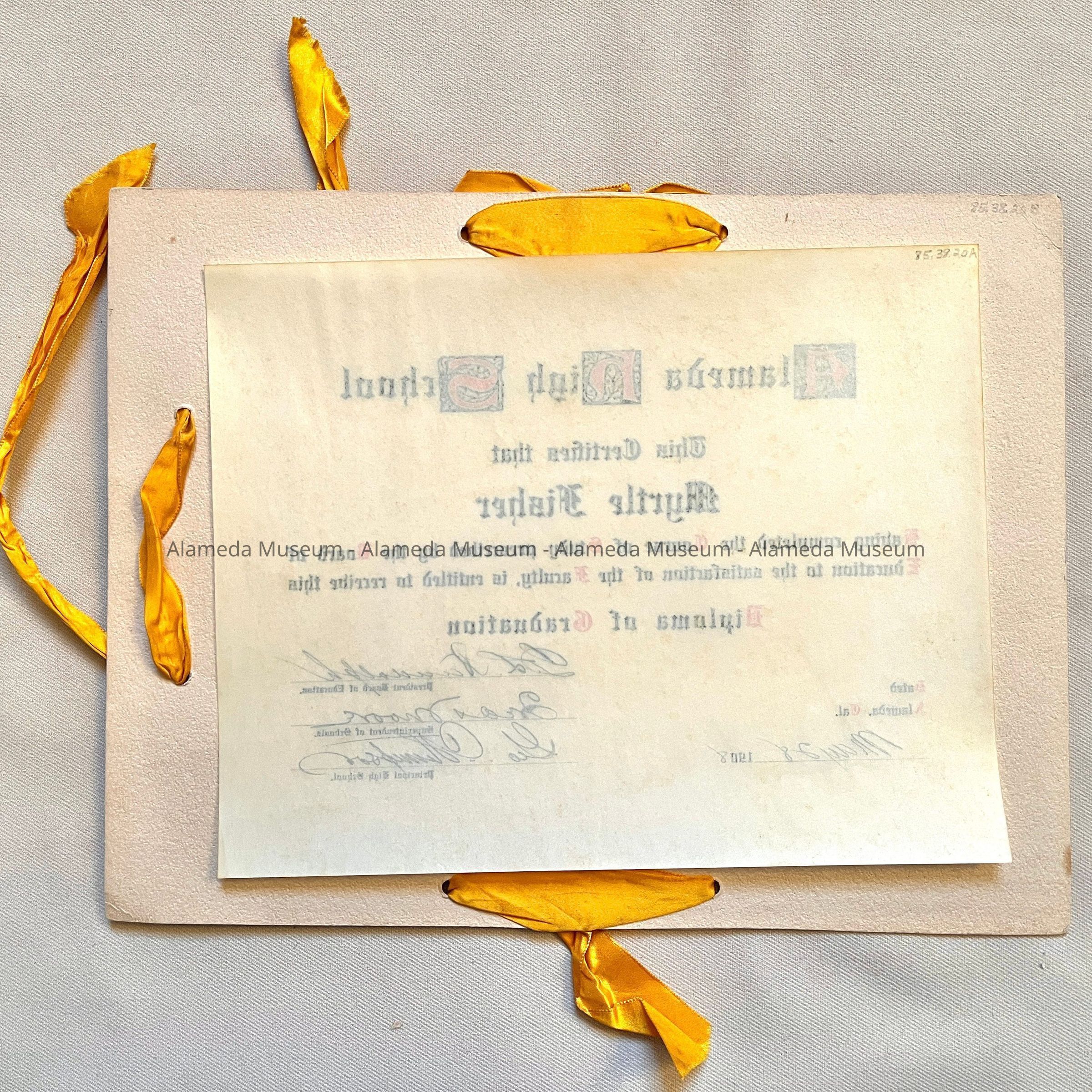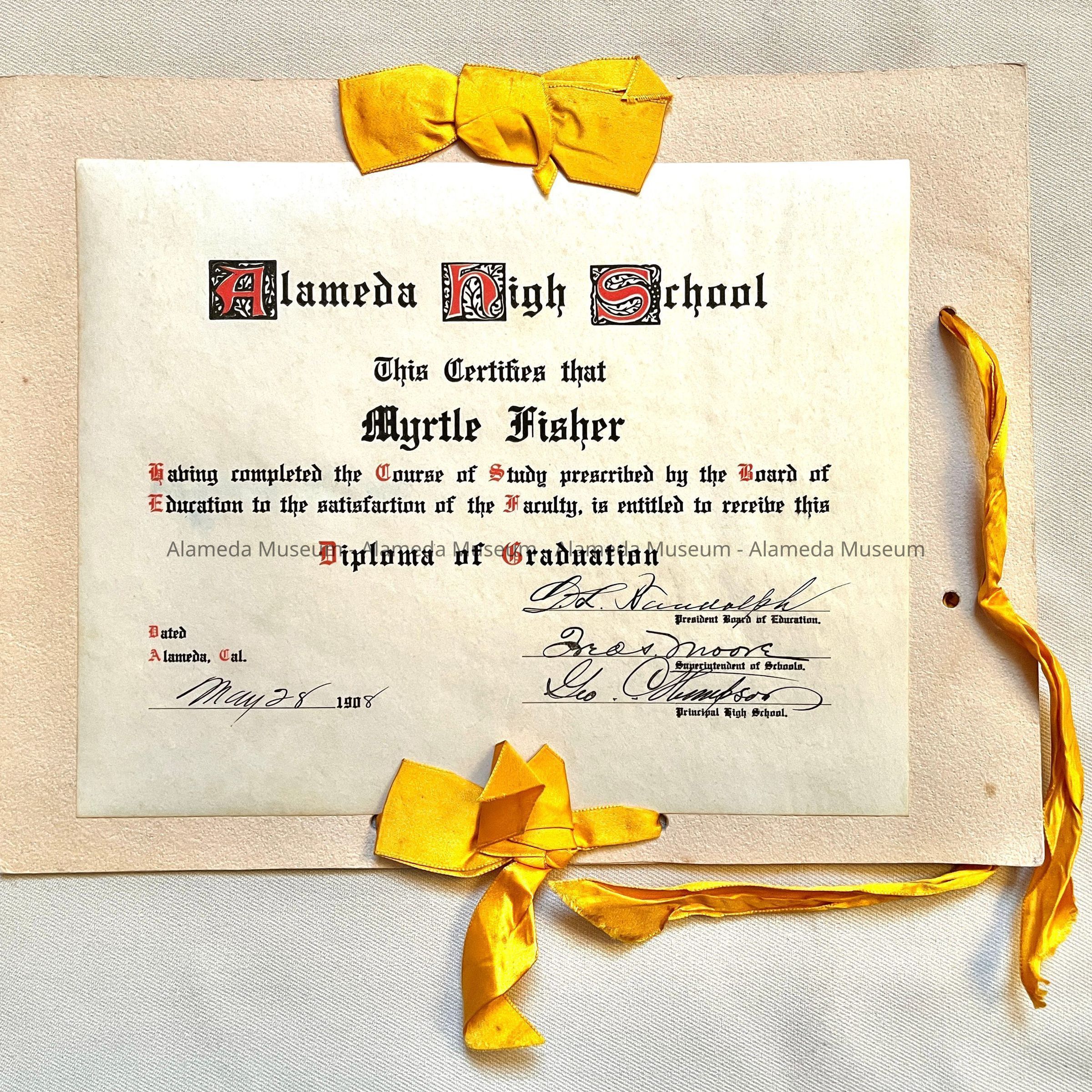 History of Object: Diploma of Graduation awarded Myrtle Fisher, from the Alameda High School, May 28, 1908.