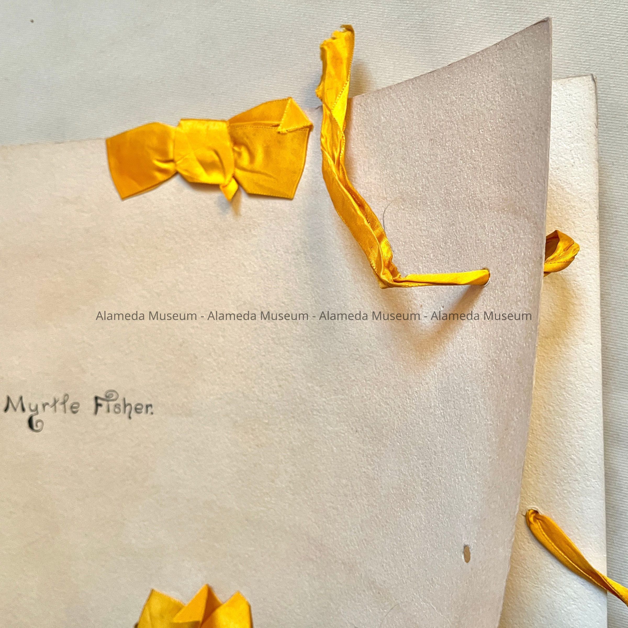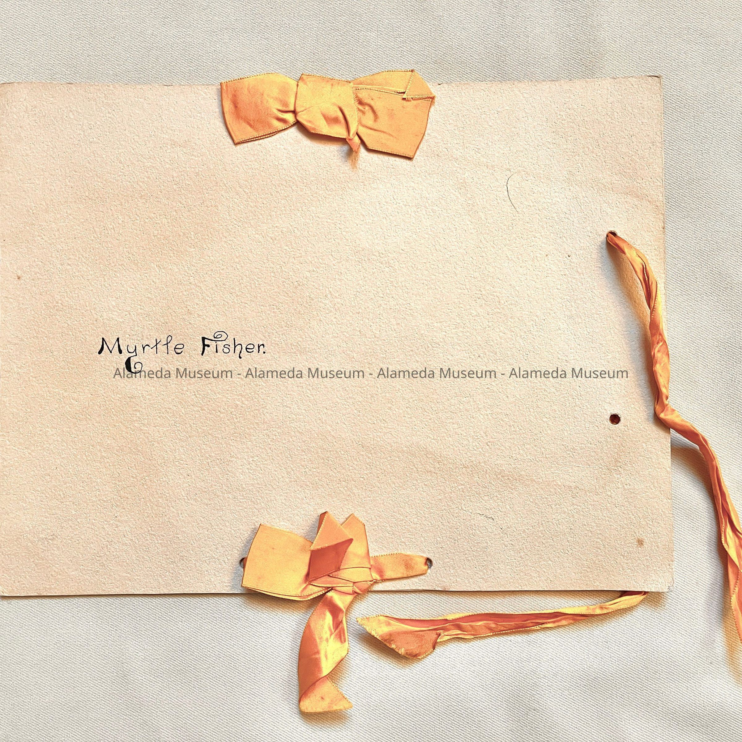 Cream colored paper cover and inscribed "Myrtle Fisher" (in ink), tied with gold silk ribbons.